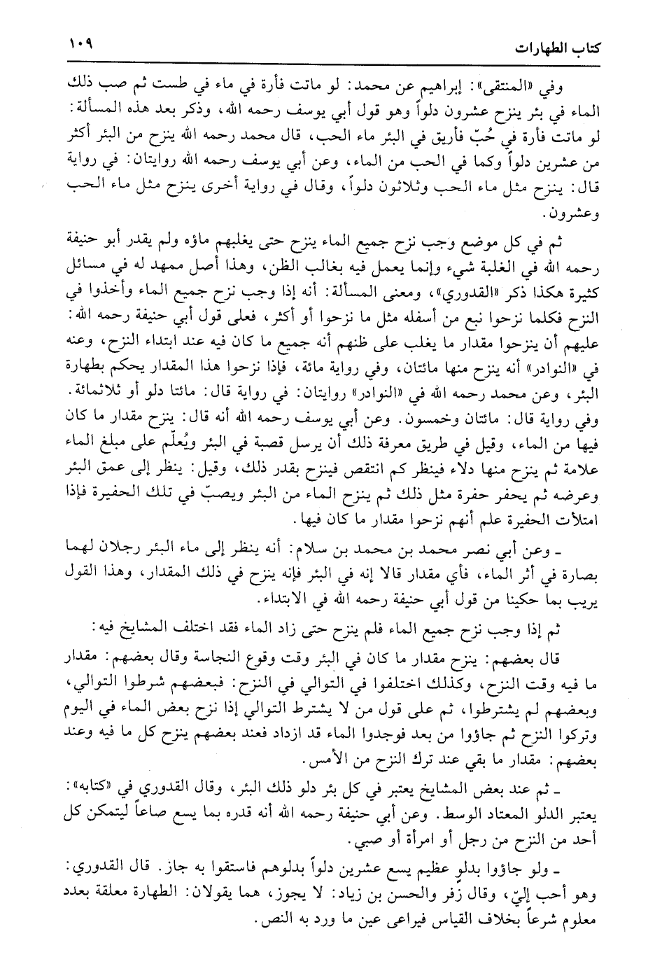 ثم في كل موضع وجب نزح جميع الماء ينزح حتى يغلبهم ماؤه ولم يقدر أبو حنيفة رحمه الله في الغلبة شيء وإنما يعمل فيه بغالب الظن، وهذا أصل ممهد له في مسائل كثيرة هكذا ذكر «القدوري» ، ومعنى المسألة: أنه إذا وجب نزح جميع الماء وأخذوا في النزح فكلما نزحوا نبع من أسفله مثل ما نزحوا أو أكثر، فعلى قول أبي حنيفة رحمه الله: عليهم أن ينزحوا مقدار ما يغلب على ظنهم أنه جميع ما كان فيه عند ابتداء النزح، وعنه في «النوادر» أنه ينزح منها مائتان، وفي رواية مائة، فإذا نزحوا هذا المقدار يحكم بطهارة البئر، وعن محمد رحمه الله في «النوادر» روايتان: في رواية قال: مائتا دلو أو ثلاثمائة. وفي رواية قال: مائتان وخمسون. وعن أبي يوسف رحمه الله أنه قال: ينزح مقدار ما كان فيها من الماء، وقيل في طريق معرفة ذلك أن يرسل قصبة في البئر ويُعلّم على مبلغ الماء علامة ثم ينزح منها دلاء فينظر كم انتقص فينزح بقدر ذلك، وقيل: ينظر إلى عمق البئر وعرضه ثم يحفر حفرة مثل ذلك ثم ينزح الماء من البئر ويصبّ في تلك الحفيرة فإذا امتلأت الحفيرة علم أنهم نزحوا مقدار ما كان فيها.