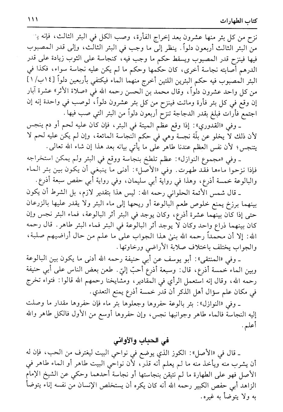 وفي «المنتقى» : أبو يوسف عن أبي حنيفة رحمه الله أدنى ما يكون بين البالوعة وبين الماء خمسة أذرع، قال: وسبعة أذرع أحبّ إليّ. طعن بعض الناس على أبي حنيفة رحمه الله، وقال إنه استعمل الرأي في المقادير، ومشايخنا رحمهم الله قالوا: فتواه تخرج في مكان علم سؤال أهل الذكر أن قدر خمسة أذرع يمنع التعدي.