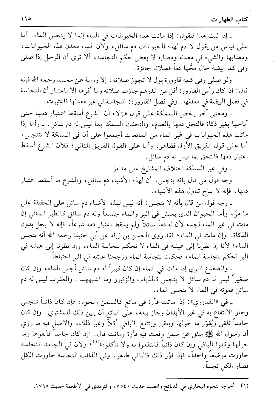 والضفدع البري إذا مات في الماء إن كان كبيراً له دم سائل نّجس الماء، وإن كان صغيراً ليس له دم سائل لا ينجس كالذباب والزنبور وما أشبههما. والعقرب ليس له دم سائل فموته في الماء لا ينجس الماء.