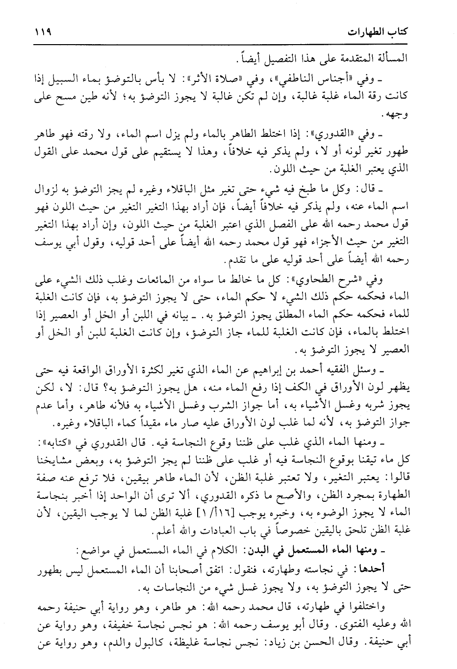 وفي «القدوري» : إذا اختلط الطاهر بالماء ولم يزل اسم الماء، ولا رقته فهو طاهر طهور تغير لونه أو لا، ولم يذكر فيه خلافاً، وهذا لا يستقيم على قول محمد على القول الذي يعتبر الغلبة من حيث اللون.