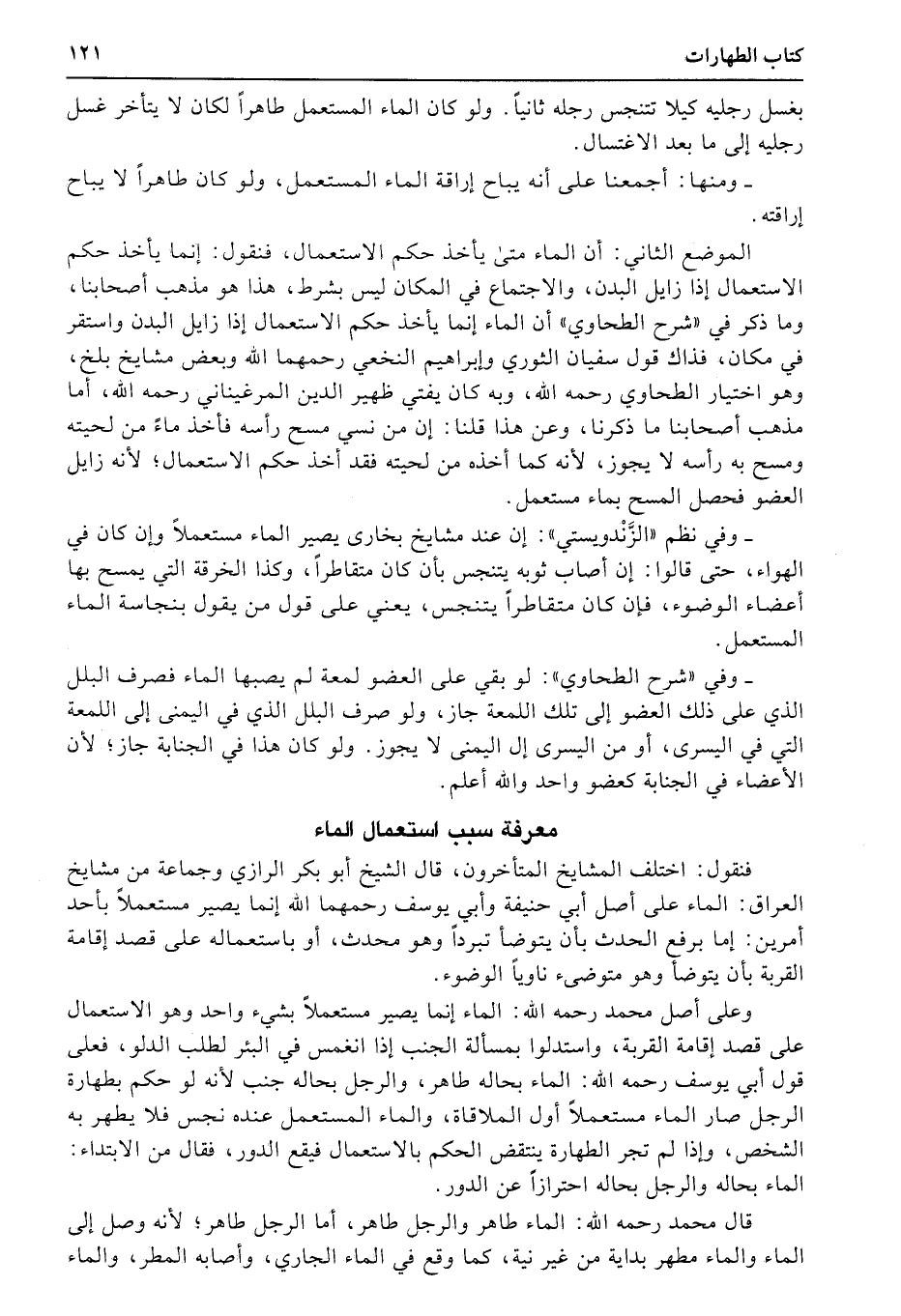 فنقول: اختلف المشايخ المتأخرون، قال الشيخ أبو بكر الرازي وجماعة من مشايخ العراق: الماء على أصل أبي حنيفة وأبي يوسف رحمهما الله إنما يصير مستعملاً بأحد أمرين: إما برفع الحدث بأن يتوضأ تبرداً وهو محدث، أو باستعماله على قصد إقامة القربة بأن يتوضأ وهو متوضىء ناوياً الوضوء.