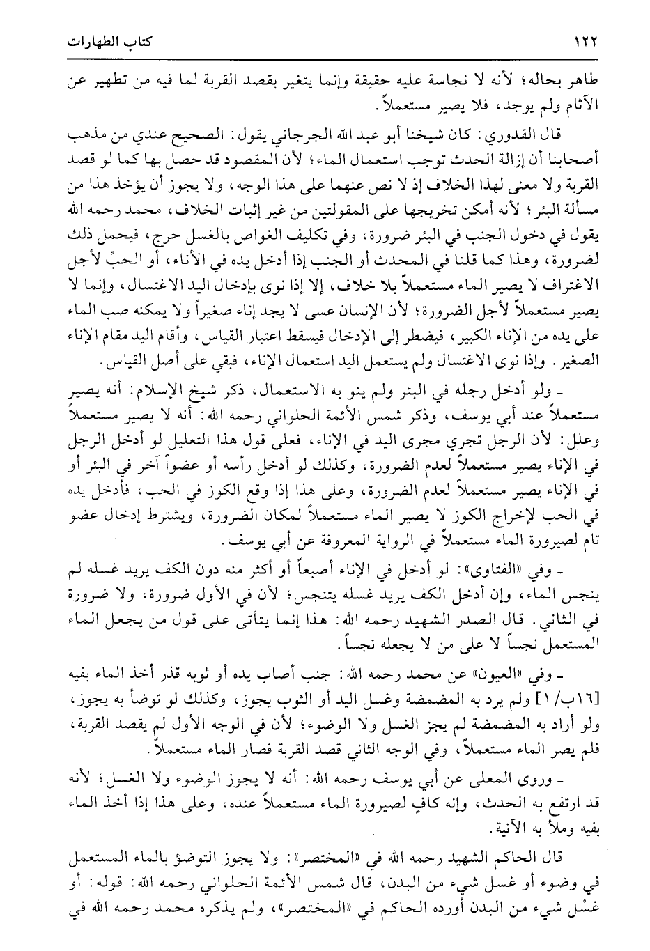 قال القدوري: كان شيخنا أبو عبد الله الجرجاني يقول: الصحيح عندي من مذهب أصحابنا أن إزالة الحدث توجب استعمال الماء؛ لأن المقصود قد حصل بها كما لو قصد القربة ولا معنى لهذا الخلاف إذ لا نص عنهما على هذا الوجه، ولا يجوز أن يؤخذ هذا من مسألة البئر؛ لأنه أمكن تخريجها على المقولتين من غير إثبات الخلاف، محمد رحمه الله يقول في دخول الجنب في البئر ضرورة، وفي تكليف الغواص بالغسل حرج، فيحمل ذلك لضرورة، وهذا كما قلنا في المحدث أو الجنب إذا أدخل يده في الأناء، أو الحبِّ لأجل الاغتراف لا يصير الماء مستعملاً بلا خلاف، إلا إذا نوى بإدخال اليد الاغتسال، وإنما لا يصير مستعملاً لأجل الضرورة؛ لأن الإنسان عسى لا يجد إناء صغيراً ولا يمكنه صب الماء على يده من الإناء الكبير، فيضطر إلى الإدخال فيسقط اعتبار القياس، وأقام اليد مقام الإناء الصغير. وإذا نوى الاغتسال ولم يستعمل اليد استعمال الإناء، فبقي على أصل القياس.