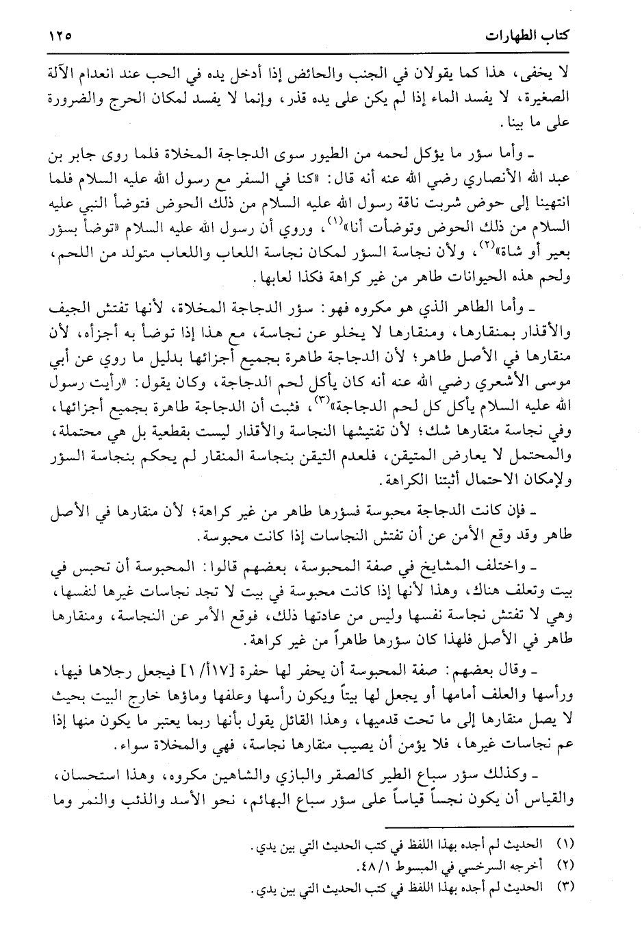 وأما الطاهر الذي هو مكروه فهو: سؤر الدجاجة المخلاة، لأنها تفتش الجيف والأقذار بمنقارها، ومنقارها لا يخلو عن نجاسة، مع هذا إذا توضأ به أجزأه، لأن منقارها في الأصل طاهر؛ لأن الدجاجة طاهرة بجميع أجزائها بدليل ما روي عن أبي موسى الأشعري رضي الله عنه أنه كان يأكل لحم الدجاجة، وكان يقول: «رأيت رسول الله عليه السلام يأكل كل لحم الدجاجة» ، فثبت أن الدجاجة طاهرة بجميع أجزائها، وفي نجاسة منقارها شك؛ لأن تفتيشها النجاسة والأقذار ليست بقطعية بل هي محتملة، والمحتمل لا يعارض المتيقن، فلعدم التيقن بنجاسة المنقار لم يحكم بنجاسة السؤر ولإمكان الاحتمال أثبتنا الكراهة.