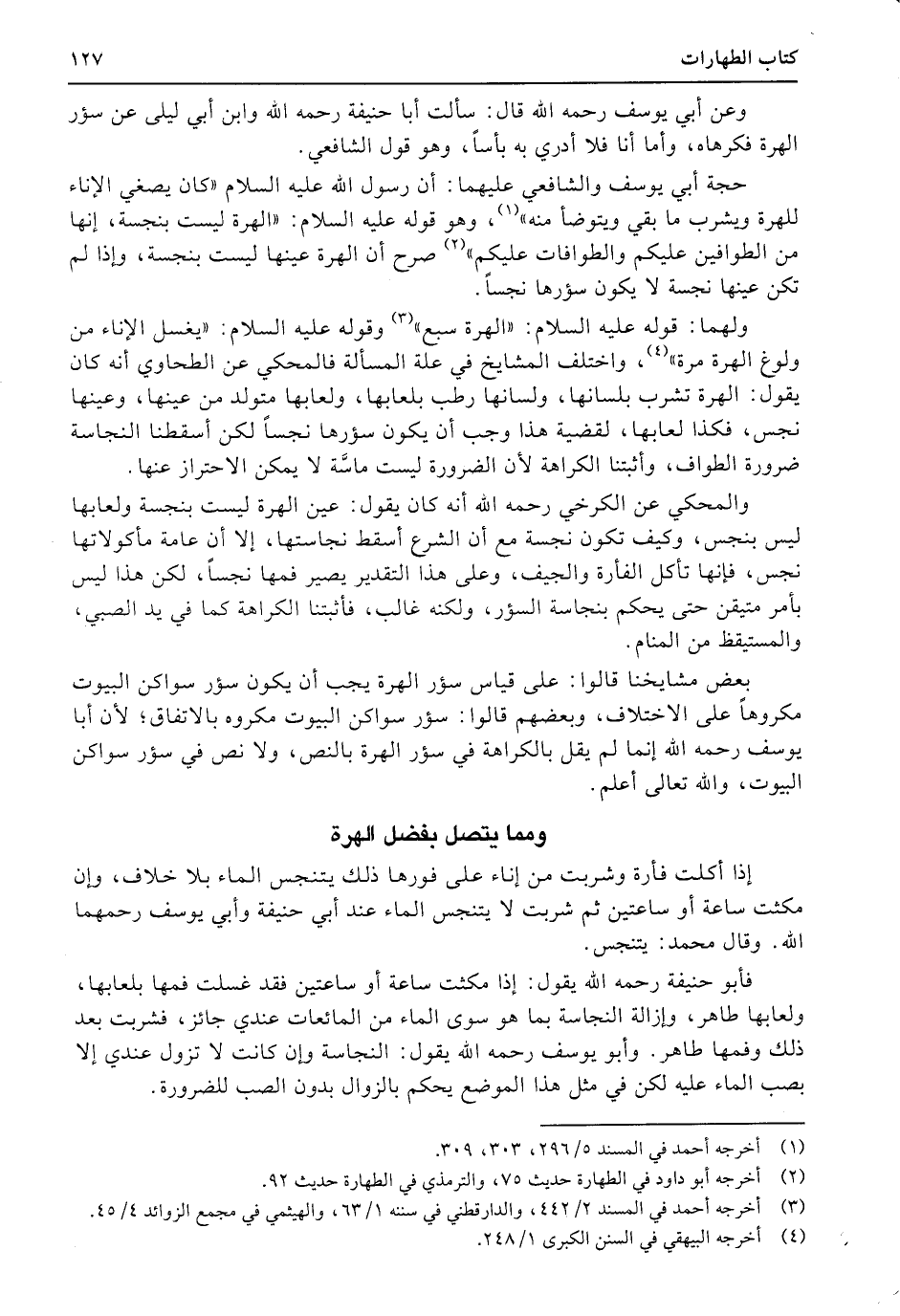 وعن أبي يوسف رحمه الله قال: سألت أبا حنيفة رحمه الله وابن أبي ليلى عن سؤر الهرة فكرهاه، وأما أنا فلا أدري به بأساً، وهو قول الشافعي.