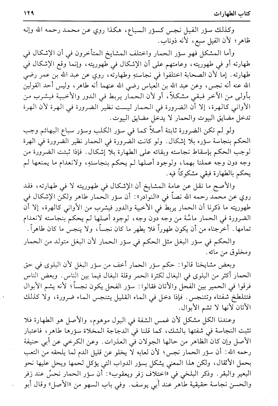 والأصح ما نقل عن عامة المشايخ أن الإشكال في طهوريته لا في طهارته، فقد روي عن محمد رحمه الله نصاً في «النوادر» : أن سؤر الحمار طاهر ولكن الإشكال في طهوريته ما ذكرنا أن الحمار يربط في الأجنبية والدور فيشرب من الأواني كالهرة، إلا أن الضرورة في الحمار ماسَّة من وجه دون وجه، لوجود أصلها لم يحكم بنجاسته لانعدام تمامها. أخرجناه من أن يكون طهوراً فلا يطهر ما كان نجساً، ولا ينجس ما كان طاهراً.