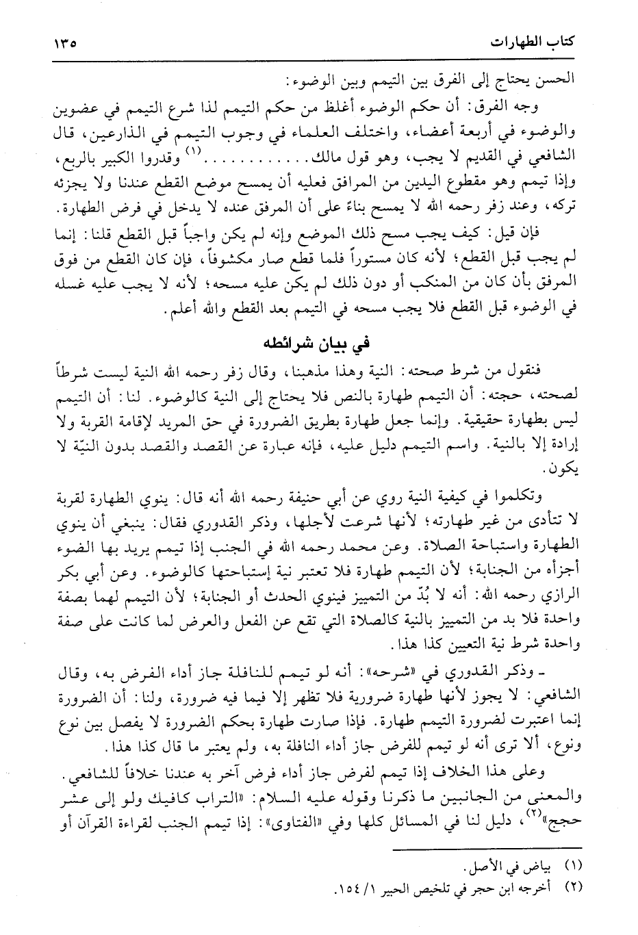 وجه الفرق: أن حكم الوضوء أغلظ من حكم التيمم لذا شرع التيمم في عضوين والوضوء في أربعة أعضاء، واختلف العلماء في وجوب التيمم في الذارعين، قال الشافعي في القديم لا يجب، وهو قول مالك............ وقدروا الكبير بالربع، وإذا تيمم وهو مقطوع اليدين من المرافق فعليه أن يمسح موضع القطع عندنا ولا يجزئه تركه، وعند زفر رحمه الله لا يمسح بناءً على أن المرفق عنده لا يدخل في فرض الطهارة.