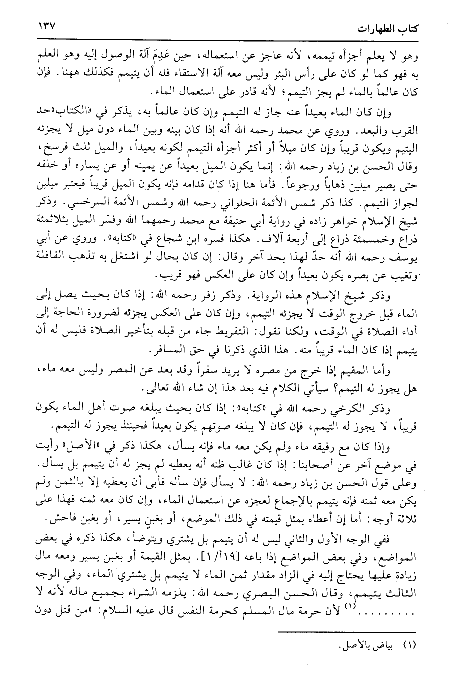 ففي الوجه الأول والثاني ليس له أن يتيمم بل يشتري ويتوضأ، هكذا ذكره في بعض المواضع، وفي بعض المواضع إذا باعه (19أ1) . بمثل القيمة أو بغبن يسير ومعه مال زيادة عليها يحتاج إليه في الزاد مقدار ثمن الماء لا يتيمم بل يشتري الماء، وفي الوجه الثالث يتيمم، وقال الحسن البصري رحمه الله: يلزمه الشراء بجميع ماله لأنه لا......... لأن حرمة مال المسلم كحرمة النفس قال عليه السلام: «من قتل دون