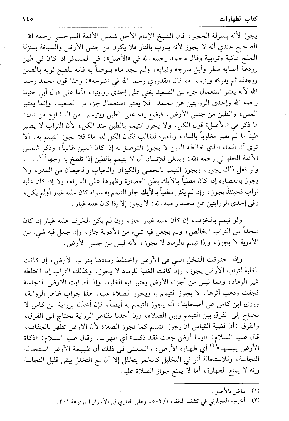 وإذا احترقت النخل التي في الأرض واختلط رمادها بتراب الأرض، إن كانت الغلبة لتراب الأرض يجوز، وإن كانت الغلبة للرماد لا يجوز، وكذلك التراب إذا اختلطه غير الرماد، ومما ليس من أجزاء الأرض يعتبر فيه الغلبة، وإذا أصابت الأرض النجاسة فجفت وذهب أثرها، لا يجوز التيمم به ويجوز الصلاة عليه، هذا جواب ظاهر الرواية، وروى ابن كاس عن أصحابنا: أنه يجوز التيمم به أيضاً، فإن أخذنا برواية ابن كاس لا نحتاج إلى الفرق بين التيمم وبين الصلاة، وإن أخذنا بظاهر الرواية نحتاج إلى الفرق، والفرق: أن قضية القياس أن يجوز التيمم كما تجوز الصلاة لأن الأرض تطهر بالجفاف، قال عليه السلام: «أيما أرض جفت فقد ذكت» أي طهرت، وقال عليه السلام: «ذكاة الأرض يبسها» أي طهارة الأرض، والمعنى في ذلك أن طبيعة الأرض استحالة النجاسة، وللاستحالة أثر في التخليل كالخمر يتخلل إلا أن مع التخلل يبقى قليل النجاسة وإنه لا يمنع الطهارة، أما لا يمنع جواز الصلاة عليه.