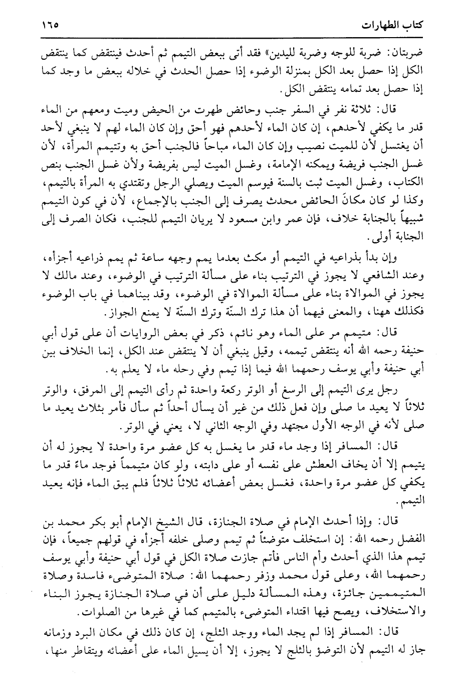 قال: ثلاثة نفر في السفر جنب وحائض طهرت من الحيض وميت ومعهم من الماء قدر ما يكفي لأحدهم، إن كان الماء لأحدهم فهو أحق وإن كان الماء لهم لا ينبغي لأحد أن يغتسل لأن للميت نصيب وإن كان الماء مباحاً فالجنب أحق به وتتيمم المرأة، لأن غسل الجنب فريضة ويمكنه الإمامة، وغسل الميت ليس بفريضة ولأن غسل الجنب بنص الكتاب، وغسل الميت ثبت بالسنة فيوسم الميت ويصلي الرجل وتقتدي به المرأة بالتيمم، وكذا لو كان مكانَ الحائض محدث يصرف إلى الجنب بالإجماع، لأن في كون التيمم شبيهاً بالجنابة خلاف، فإن عمر وابن مسعود لا يريان التيمم للجنب، فكان الصرف إلى الجنابة أولى.