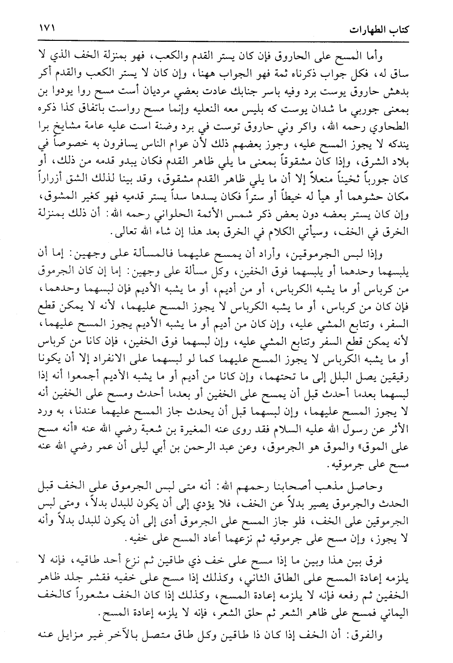 وأما المسح على الحاروق فإن كان يستر القدم والكعب، فهو بمنزلة الخف الذي لا ساق له، فكل جواب ذكرناه ثمة فهو الجواب ههنا، وإن كان لا يستر الكعب والقدم أكر بدهش حاروق يوست برد وفيه باسر جنابك عادت بعضي مرديان أست مسح روا يودوا بن بمعنى جوربي ما شدان يوست كه بليس معه النعليه وإنما مسح رواست باتفاق كذا ذكره الطحاوي رحمه الله، واكر وني حاروق توست في برد وضنة است عليه عامة مشايخ برا يندكه لا يجوز المسح عليه، وجوز بعضهم ذلك لأن عوام الناس يسافرون به خصوصاً في بلاد الشرق، وإذا كان مشقوقاً بمعنى ما يلي ظاهر القدم فكان يبدو قدمه من ذلك، أو كان جورباً ثخيناً منعلاً إلا أن ما يلي ظاهر القدم مشقوق، وقد بينا لذلك الشق أزراراً مكان حشوهما أو هيأ له خيطاً أو ستراً فكان يسدها سداً يستر قدميه فهو كغير المشوق، وإن كان يستر بعضه دون بعض ذكر شمس الأئمة الحلواني رحمه الله: أن ذلك بمنزلة الخرق في الخف، وسيأتي الكلام في الخرق بعد هذا إن شاء الله تعالى.