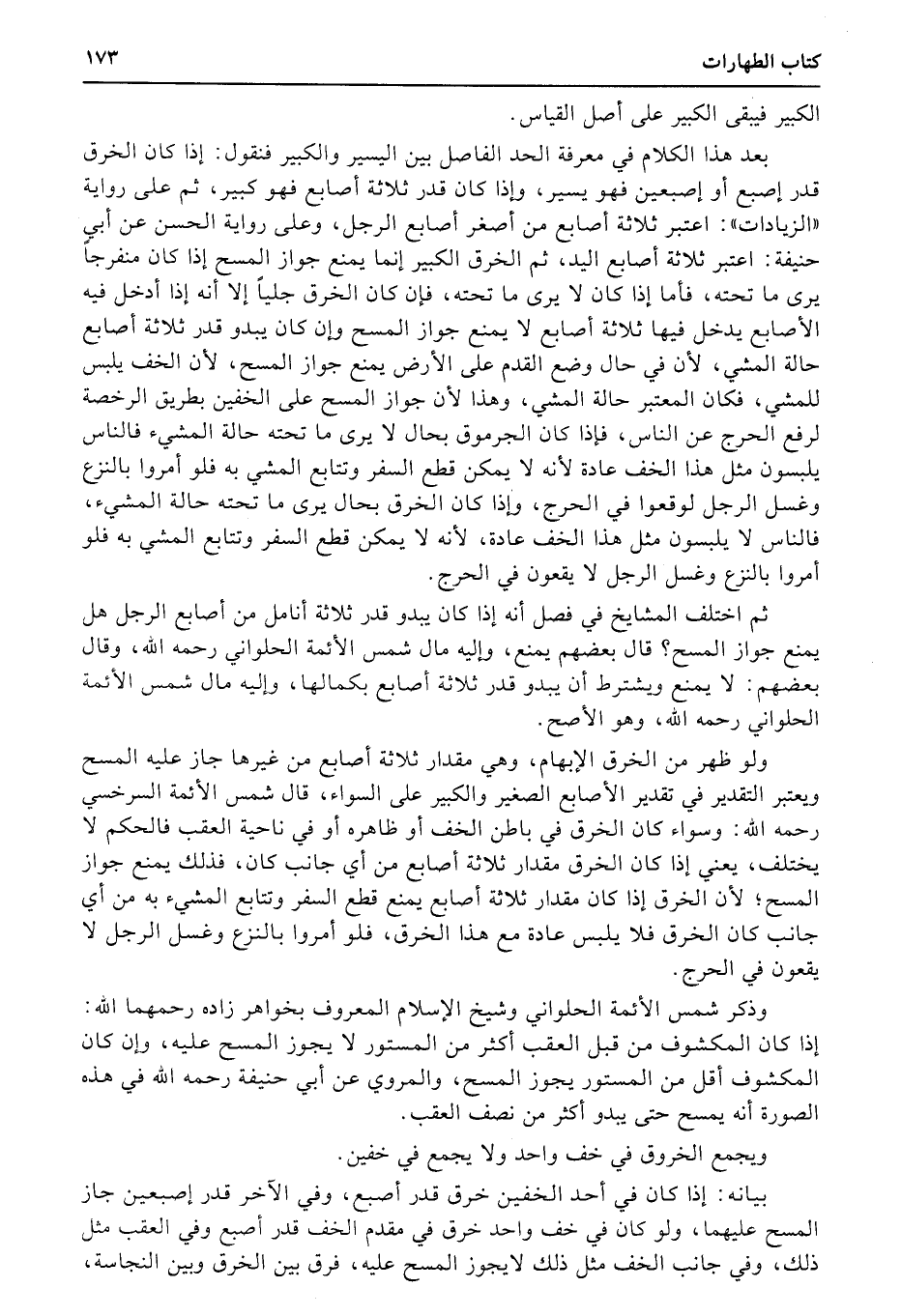 بعد هذا الكلام في معرفة الحد الفاصل بين اليسير والكبير فنقول: إذا كان الخرق قدر إصبع أو إصبعين فهو يسير، وإذا كان قدر ثلاثة أصابع فهو كبير، ثم على رواية «الزيادات» : اعتبر ثلاثة أصابع من أصغر أصابع الرجل، وعلى رواية الحسن عن أبي حنيفة: اعتبر ثلاثة أصابع اليد، ثم الخرق الكبير إنما يمنع جواز المسح إذا كان منفرجاً يرى ما تحته، فأما إذا كان لا يرى ما تحته، فإن كان الخرق جلياً إلا أنه إذا أدخل فيه الأصابع يدخل فيها ثلاثة أصابع لا يمنع جواز المسح وإن كان يبدو قدر ثلاثة أصابع حالة المشي، لأن في حال وضع القدم على الأرض يمنع جواز المسح، لأن الخف يلبس للمشي، فكان المعتبر حالة المشي، وهذا لأن جواز المسح على الخفين بطريق الرخصة لرفع الحرج عن الناس، فإذا كان الجرموق بحال لا يرى ما تحته حالة المشيء فالناس يلبسون مثل هذا الخف عادة لأنه لا يمكن قطع السفر وتتابع المشي به فلو أمروا بالنزع وغسل الرجل لوقعوا في الحرج، وإذا كان الخرق بحال يرى ما تحته حالة المشيء، فالناس لا يلبسون مثل هذا الخف عادة، لأنه لا يمكن قطع السفر وتتابع المشي به فلو أمروا بالنزع وغسل الرجل لا يقعون في الحرج.