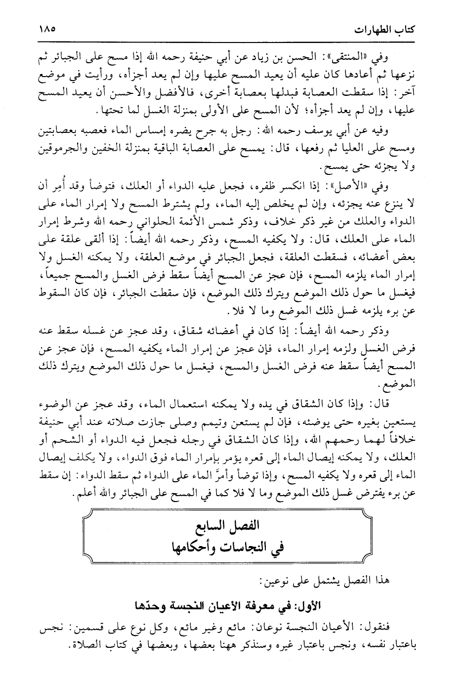 وفيه عن أبي يوسف رحمه الله: رجل به جرح يضره إمساس الماء فعصبه بعصابتين ومسح على العليا ثم رفعها، قال: يمسح على العصابة الباقية بمنزلة الخفين والجرموقين ولا يجزئه حتى يمسح.