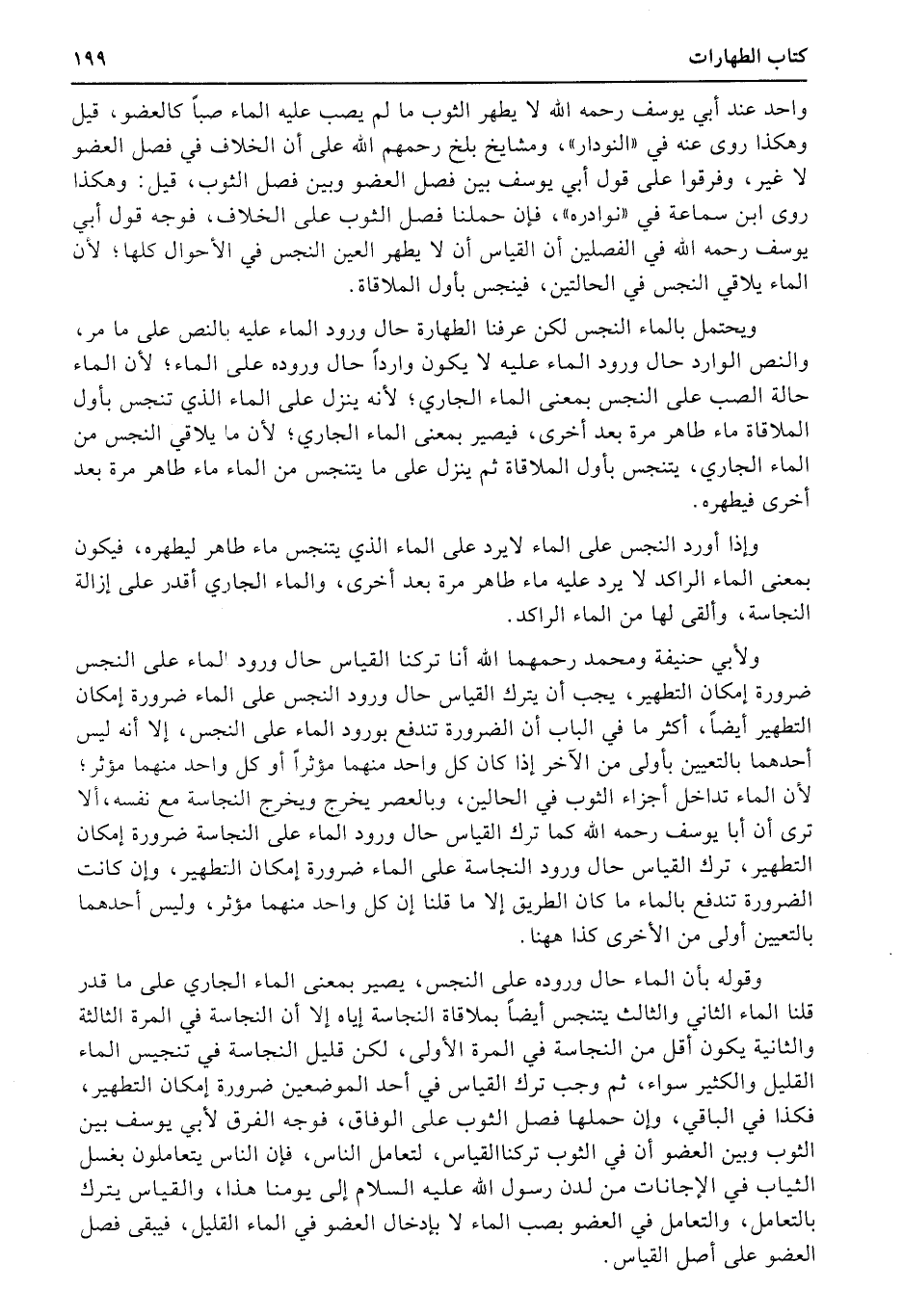 وقوله بأن الماء حال وروده على النجس، يصير بمعنى الماء الجاري على ما قدر قلنا الماء الثاني والثالث يتنجس أيضاً بملاقاة النجاسة إياه إلا أن النجاسة في المرة الثالثة والثانية يكون أقل من النجاسة في المرة الأولى، لكن قليل النجاسة في تنجيس الماء القليل والكثير سواء، ثم وجب ترك القياس في أحد الموضعين ضرورة إمكان التطهير، فكذا في الباقي، وإن حملها فصل الثوب على الوفاق، فوجه الفرق لأبي يوسف بين الثوب وبين العضو أن في الثوب تركناالقياس، لتعامل الناس، فإن الناس يتعاملون بغسل الثياب في الإجانات من لدن رسول الله عليه السلام إلى يومنا هذا، والقياس يترك بالتعامل، والتعامل في العضو بصب الماء لا بإدخال العضو في الماء القليل، فيبقى فصل العضو على أصل القياس.