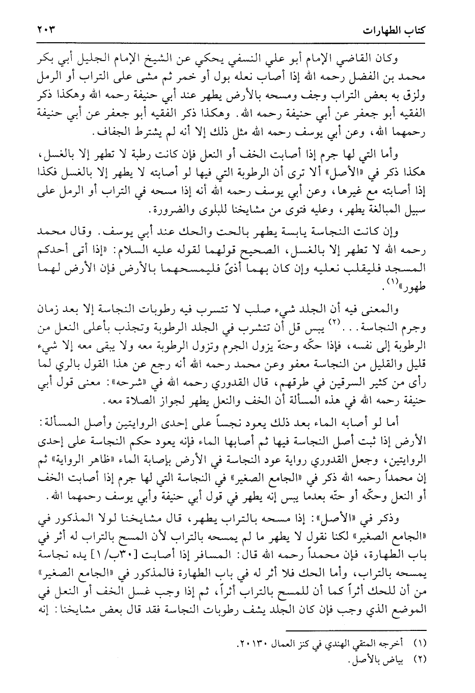 والمعنى فيه أن الجلد شيء صلب لا تتسرب فيه رطوبات النجاسة إلا بعد زمان وجرم النجاسة ... يبس قل أن تتشرب في الجلد الرطوبة وتجذب بأعلى النعل من الرطوبة إلى نفسه، فإذا حكّه وحتهّ يزول الجرم وتزول الرطوبة معه ولا يبقى معه إلا شيء قليل والقليل من النجاسة معفو وعن محمد رحمه الله أنه رجع عن هذا القول بالري لما رأى من كثير السرقين في طرقهم، قال القدوري رحمه الله في «شرحه» : معنى قول أبي حنيفة رحمه الله في هذه المسألة أن الخف والنعل يطهر لجواز الصلاة معه.
