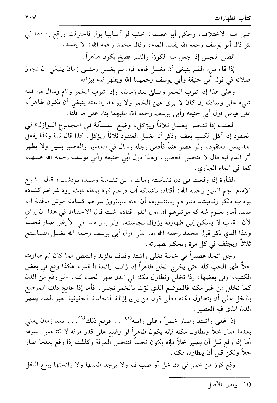 إذا غلى واشتد وصار خمراً وعلى رأسه ... فرفع ذلك ... بعد زمان يعني بعدما صار خلاّ وتطاول مكثه فإنه يكون طاهراً لو وضع على قدر مرقة لا تتنجس المرقة أما إذا رفع قبل أن يصير خلاً فإنه يكون نجساً فتنجس المرقة وكذلك إذا رفع بعدما صار خلاً ولكن قبل أن يتطاول مكثه.
