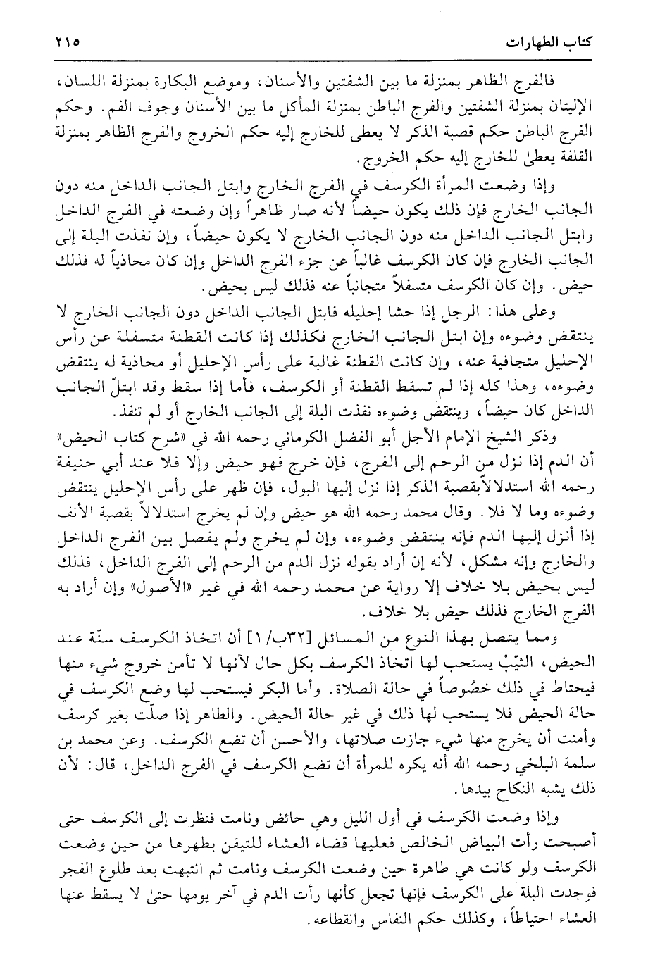 وذكر الشيخ الإمام الأجل أبو الفضل الكرماني رحمه الله في «شرح كتاب الحيض» أن الدم إذا نزل من الرحم إلى الفرج، فإن خرج فهو حيض وإلا فلا عند أبي حنيفة رحمه الله استدلالاًبقصبة الذكر إذا نزل إليها البول، فإن ظهر على رأس الإحليل ينتقض وضوءه وما لا فلا. وقال محمد رحمه الله هو حيض وإن لم يخرج استدلالاً بقصبة الأنف إذا أنزل إليها الدم فإنه ينتقض وضوءه، وإن لم يخرج ولم يفصل بين الفرج الداخل والخارج وإنه مشكل، لأنه إن أراد بقوله نزل الدم من الرحم إلى الفرج الداخل، فذلك ليس بحيض بلا خلاف إلا رواية عن محمد رحمه الله في غير «الأصول» وإن أراد به الفرج الخارج فذلك حيض بلا خلاف.