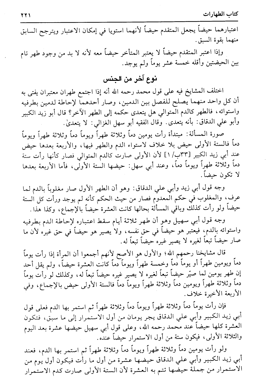 اختلف المشايخ فيه على قول محمد رحمه الله أنه إذا اجتمع طهران معتبران يفتى به أن كل واحد منهما يصلح للفصل بين الدمين، وصار أحدهما لإحاطة لدمين بطرفيه واستوائه، فالطهر كالدم المتوالي هل يتعدى حكمه إلى الطهر الآخر؟ قال أبو زيد الكبير وأبو علي الدقاق: بأنه يتعدى. وقال الفقيه أبو سهل الغزالي: لا يتعدى.