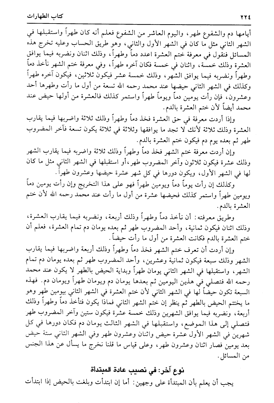 وإن أردت أن تعرف ختم الشهر فخذ دماً وطهراً وذلك أربعة واضربها فيما يقارب الشهر وذلك سبعة فيكون ثمانية وعشرين، وأحد المضروب طهر ثم بعده يومان دم تمام الشهر، واستقبلها في الشهر الثاني يومان طهراً وبداية الحيض بالطهر لا يكون عند محمد رحمه الله فتصلي في هذين اليومين ثم بعدها يومان دم ويومان طهراً ويومان دم. فهذه السبعة تكون حيضاً لها في الشهر الثاني لأن ختم العشرة في الشهر الثاني بيومين طهر وهو ما يختتم الحيض بالطهر ثم ينظر إن ختم الشهر الثاني فماذا يكون فتأخذ دماً وطهراً وذلك أربعة، ونضربه فيما يوافق الشهرين وذلك خمسة عشرة فيكون ستين وآخر المضروب طهر فتصلي إلى هذا الموضع، واستقبلها في الشهر الثالث يومان دم فكان دورها في كل شهرين في الشهر الأول عشرة حيض واثنان وعشرون طهر وفي الشهر الثاني ستة حيض بعد يومين فصار اثنان وعشرون طهر، وعلى قياس ما قلنا نخرج ما يسأل عن هذا الجنس من المسائل.