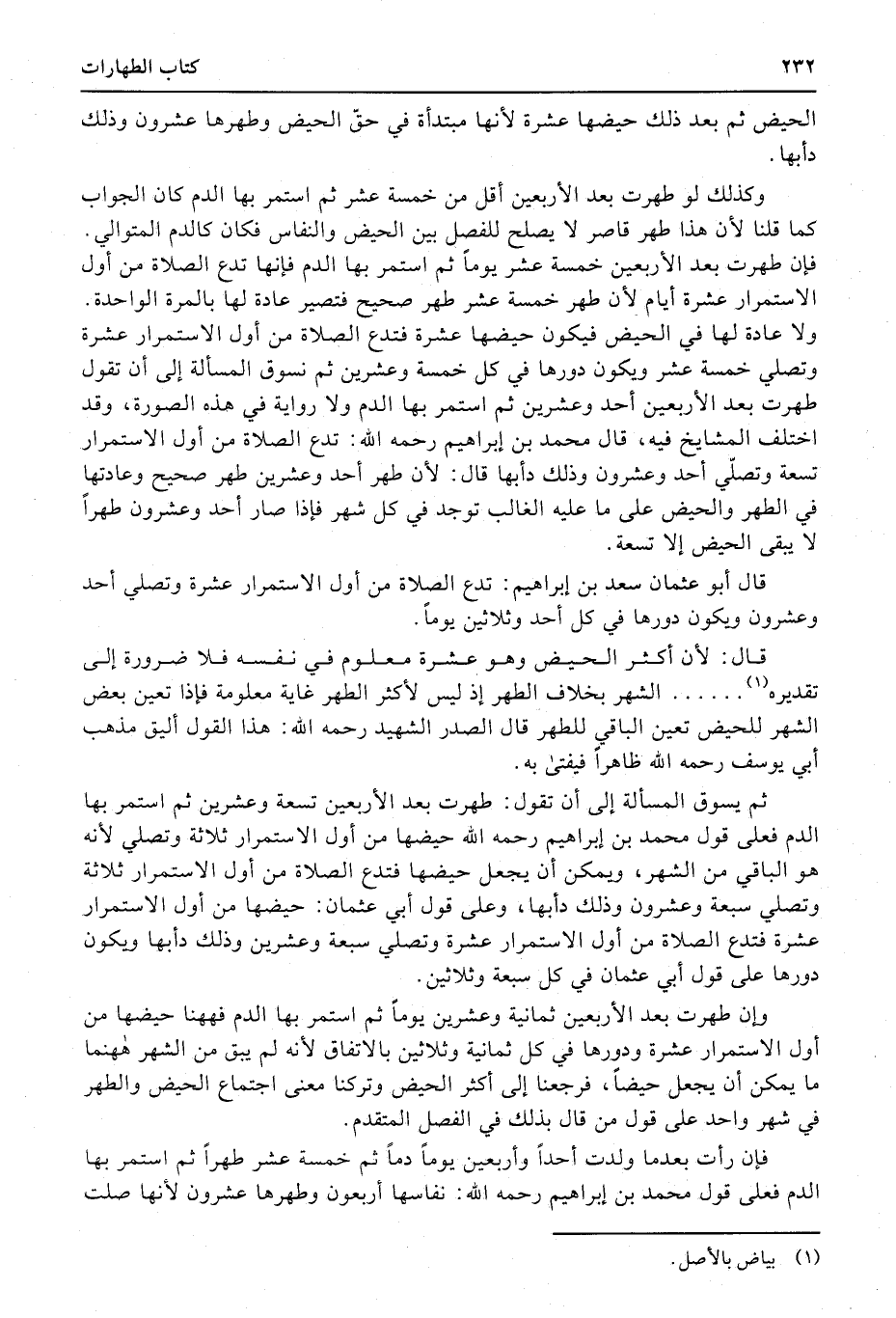 ثم يسوق المسألة إلى أن تقول: طهرت بعد الأربعين تسعة وعشرين ثم استمر بها الدم فعلى قول محمد بن إبراهيم رحمه الله حيضها من أول الاستمرار ثلاثة وتصلي لأنه هو الباقي من الشهر، ويمكن أن يجعل حيضها فتدع الصلاة من أول الاستمرار ثلاثة وتصلي سبعة وعشرون وذلك دأبها، وعلى قول أبي عثمان: حيضها من أول الاستمرار عشرة فتدع الصلاة من أول الاستمرار عشرة وتصلي سبعة وعشرين وذلك دأبها ويكون دورها على قول أبي عثمان في كل سبعة وثلاثين.