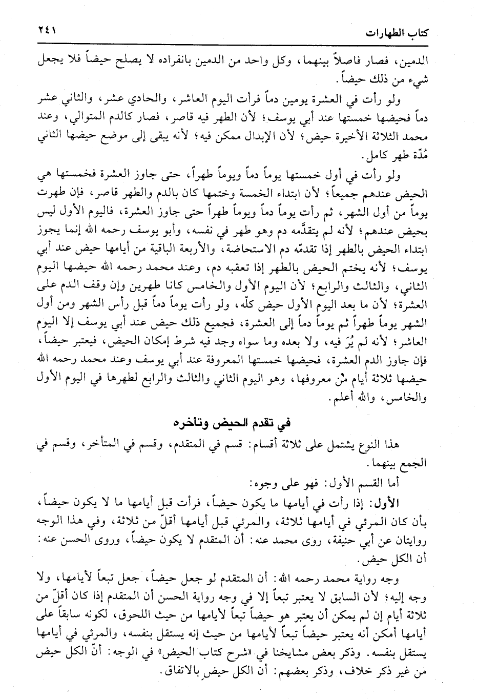 ولو رأت في أول خمستها يوماً دماً ويوماً طهراً، حتى جاوز العشرة فخمستها هي الحيض عندهم جميعاً؛ لأن ابتداء الخمسة وختمها كان بالدم والطهر قاصر، فإن طهرت يوماً من أول الشهر، ثم رأت يوماً دماً ويوماً طهراً حتى جاوز العشرة، فاليوم الأول ليس بحيض عندهم؛ لأنه لم يتقدَّمه دم وهو طهر في نفسه، وأبو يوسف رحمه الله إنما يجوز ابتداء الحيض بالطهر إذا تقدمّه دم الاستحاضة، والأربعة الباقية من أيامها حيض عند أبي يوسف؛ لأنه يختم الحيض بالطهر إذا تعقبه دم، وعند محمد رحمه الله حيضها اليوم الثاني، والثالث والرابع؛ لأن اليوم الأول والخامس كانا طهرين وإن وقف الدم على العشرة؛ لأن ما بعد اليوم الأول حيض كلّه، ولو رأت يوماً دماً قبل رأس الشهر ومن أول الشهر يوماً طهراً ثم يوماً دماً إلى العشرة، فجميع ذلك حيض عند أبي يوسف إلا اليوم العاشر؛ لأنه لم يُرَ فيه، ولا بعده وما سواه وجد فيه شرط إمكان الحيض، فيعتبر حيضاً، فإن جاوز الدم العشرة، فحيضها خمستها المعروفة عند أبي يوسف وعند محمد رحمه الله حيضها ثلاثة أيام من معروفها، وهو اليوم الثاني والثالث والرابع لطهرها في اليوم الأول والخامس، والله أعلم.
