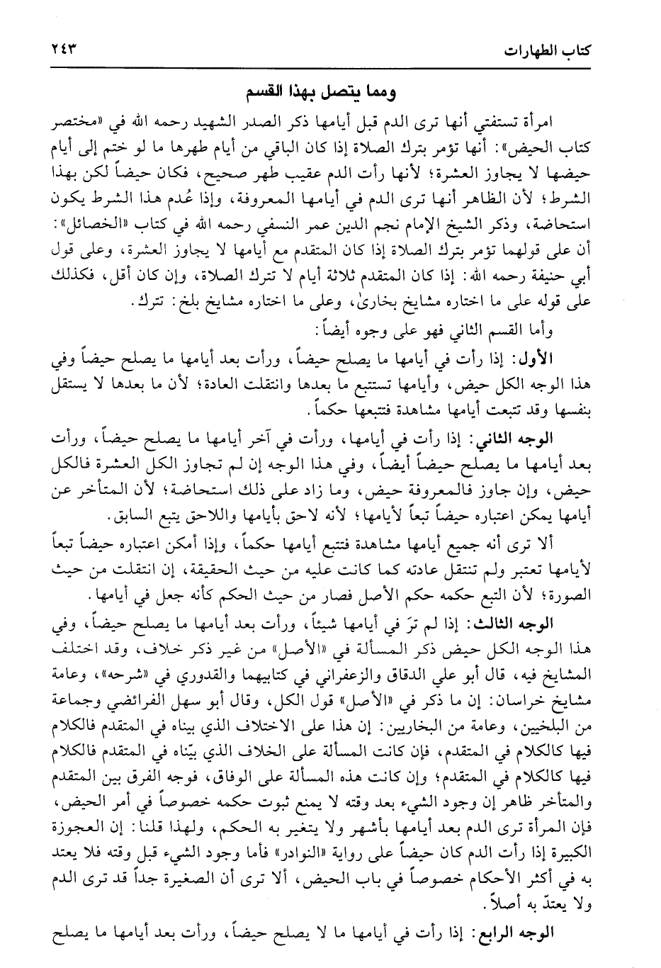 الوجه الثالث: إذا لم ترَ في أيامها شيئاً، ورأت بعد أيامها ما يصلح حيضاً، وفي هذا الوجه الكل حيض ذكر المسألة في «الأصل» من غير ذكر خلاف، وقد اختلف المشايخ فيه، قال أبو علي الدقاق والزعفراني في كتابيهما والقدوري في «شرحه» ، وعامة مشايخ خراسان: إن ما ذكر في «الأصل» قول الكل، وقال أبو سهل الفرائضي وجماعة من البلخيين، وعامة من البخاريين: إن هذا على الاختلاف الذي بيناه في المتقدم فالكلام فيها كالكلام في المتقدم، فإن كانت المسألة على الخلاف الذي بيّناه في المتقدم فالكلام فيها كالكلام في المتقدم؛ وإن كانت هذه المسألة على الوفاق، فوجه الفرق بين المتقدم والمتأخر ظاهر إن وجود الشيء بعد وقته لا يمنع ثبوت حكمه خصوصاً في أمر الحيض، فإن المرأة ترى الدم بعد أيامها بأشهر ولا يتغير به الحكم، ولهذا قلنا: إن العجوزة الكبيرة إذا رأت الدم كان حيضاً على رواية «النوادر» فأما وجود الشيء قبل وقته فلا يعتد به في أكثر الأحكام خصوصاً في باب الحيض، ألا ترى أن الصغيرة جداً قد ترى الدم ولا يعتدّ به أصلاً.