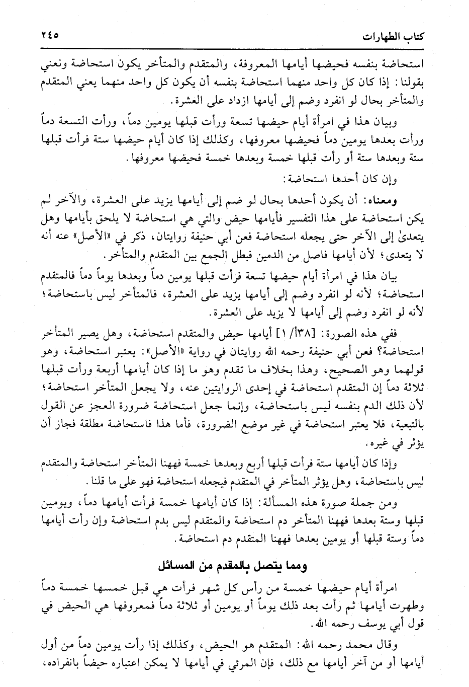 ومن جملة صورة هذه المسألة: إذا كان أيامها خمسة فرأت أيامها دماً، ويومين قبلها وستة بعدها فههنا المتأخر دم استحاضة والمتقدم ليس بدم استحاضة وإن رأت أيامها دماً وستة قبلها أو يومين بعدها فههنا المتقدم دم استحاضة.