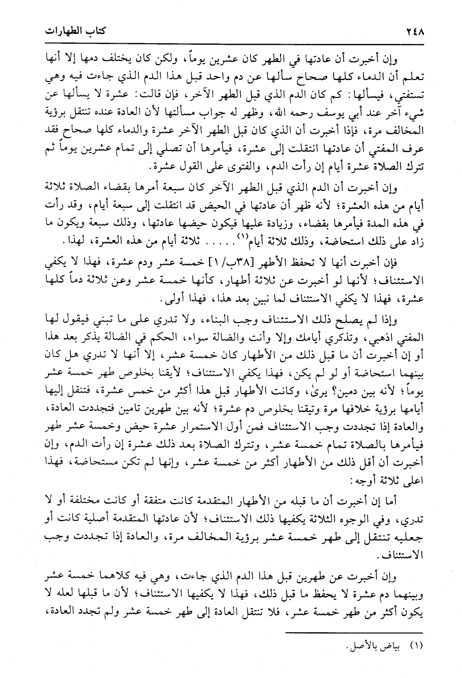 وإذا لم يصلح ذلك الاستئناف وجب البناء، ولا تدري على ما تبني فيقول لها المفتي اذهبي، وتذكري أيامك وإلا وأنت والضالة سواء، الحكم في الضالة يذكر بعد هذا أو إن أخبرت أن ما قبل ذلك من الأطهار كان خمسة عشر، إلا أنها لا تدري هل كان بينهما استحاضة أو لو لم يكن، فهذا يكفي الاستئناف؛ لأتيقنا بخلوص طهر خمسة عشر يوماً؛ لأنه بين دمين؟ يرى، وكانت الأطهار قبل هذا أكثر من خمس عشرة، فتنقل إليها أيامها برؤية خلافها مرة وتيقنا بخلوص دم عشرة؛ لأنه بين طهرين تامين فتجددت العادة، والعادة إذا تجددت وجب الاستئناف فمن أول الاستمرار عشرة حيض وخمسة عشر طهر فيأمرها بالصلاة تمام خمسة عشر، وتترك الصلاة بعد ذلك عشرة إن رأت الدم، وإن أخبرت أن أقل ذلك من الأطهار أكثر من خمسة عشر، وإنها لم تكن مستحاضة، فهذا اعلى ثلاثة أوجه: