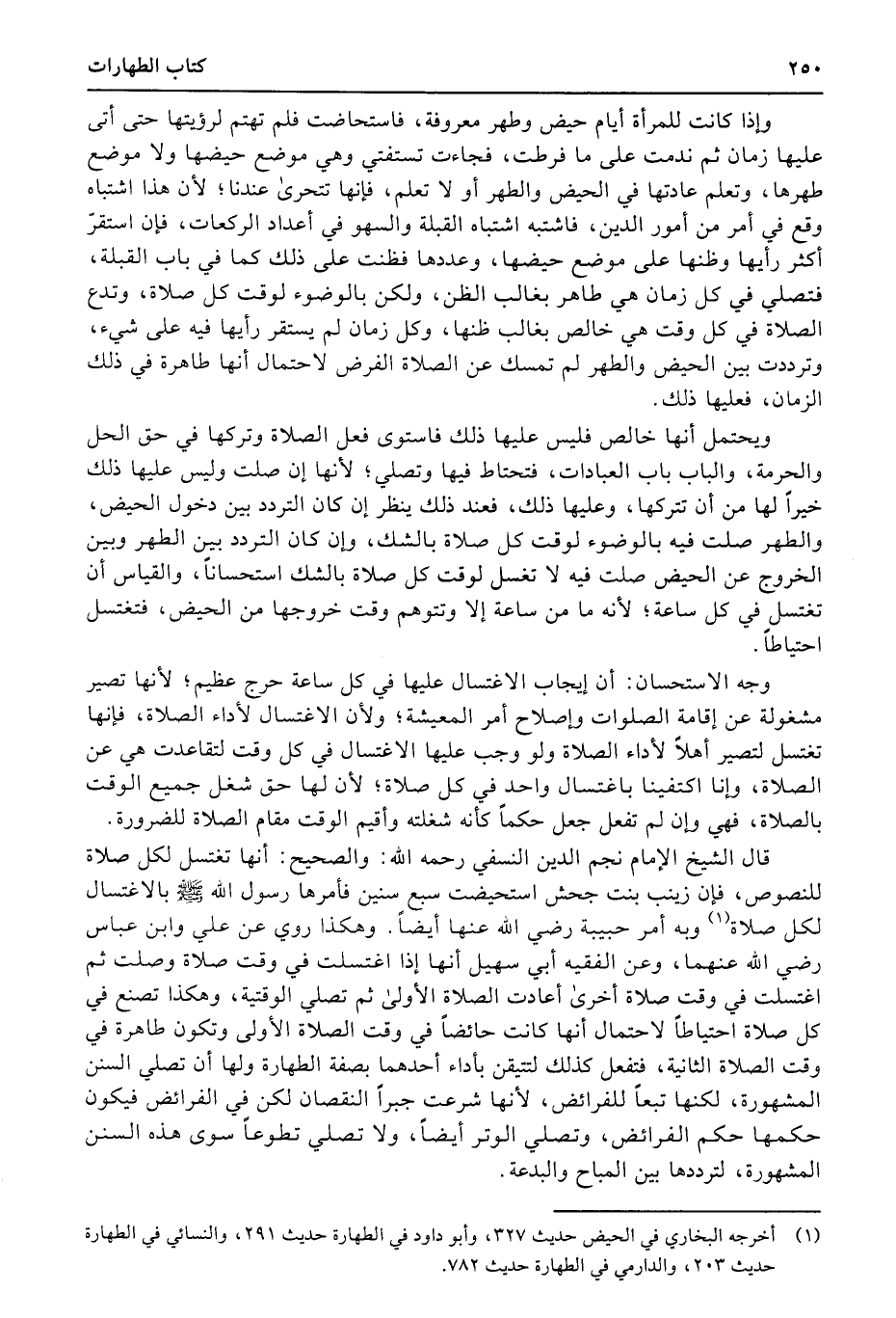 قال الشيخ الإمام نجم الدين النسفي رحمه الله: والصحيح: أنها تغتسل لكل صلاة للنصوص، فإن زينب بنت جحش استحيضت سبع سنين فأمرها رسول الله صلى الله عليه وسلّمبالاغتسال لكل صلاة وبه أمر حبيبة رضي الله عنها أيضاً. وهكذا روي عن علي وابن عباس رضي الله عنهما، وعن الفقيه أبي سهيل أنها إذا اغتسلت في وقت صلاة وصلت ثم اغتسلت في وقت صلاة أخرى أعادت الصلاة الأولى ثم تصلي الوقتية، وهكذا تصنع في كل صلاة احتياطاً لاحتمال أنها كانت حائضاً في وقت الصلاة الأولى وتكون طاهرة في وقت الصلاة الثانية، فتفعل كذلك لتتيقن بأداء أحدهما بصفة الطهارة ولها أن تصلي السنن المشهورة، لكنها تبعاً للفرائض، لأنها شرعت جبراً النقصان لكن في الفرائض فيكون حكمها حكم الفرائض، وتصلي الوتر أيضاً، ولا تصلي تطوعاً سوى هذه السنن المشهورة، لترددها بين المباح والبدعة.