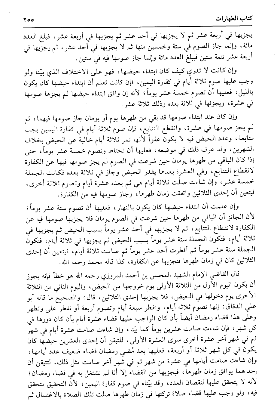 قال القاضي الإمام الشهيد المحسن بن أحمد المروزي رحمه الله هو خطأ فإنه يجوز أن يكون اليوم الأول من الثلاثة الأولى يوم خروجها من الحيض، واليوم الثاني من الثلاثة الأخرى يوم دخولها في الحيض، فلا يجزيها إحدى الثلاثين، قال: والصحيح ما قاله أبو علي الدقاق: إنها تصوم ثلاثة أيام، وتفطر سبعة أيام وتصوم أربعة أو تفطر على وتطهر وعلى هذا قضاء رمضان أيضاً بأن كان الواجب عليها قضاء عشرة أيام بأن كان دورها في كل شهر، فإن شاءت صامت عشرين يوماً كما بيّنا، وإن شاءت صامت عشرة أيام في شهر ثم في شهر آخر عشرة أخرى سوى العشرة الأولى، للتيقن أن إحدى العشرين حيضها كان يكون في كل شهر ثلاثة أو أربعة، فعليها بعد مُضي رمضان قضاء ضعيف عدد أيامها، وإن شاءت صامت أيامها في عشرة من شهر ثم في شهر آخر صامت مثل ذلك، لتتيقن أن إحداهما يوافق زمان طهرها، فيجزيها من القضاء إلا أنا لم نشتغل به في قضاء رمضان؛ لأنه لا يتحقق عليها لنقصان العدد، وقد بيّناه في صوم كفارة اليمين؛ لأن التحقيق متحقق فيه، ولو وجب عليها قضاء صلاة تركتها في زمان طهرها صلت تلك الصلاة بالاغتسال ثم