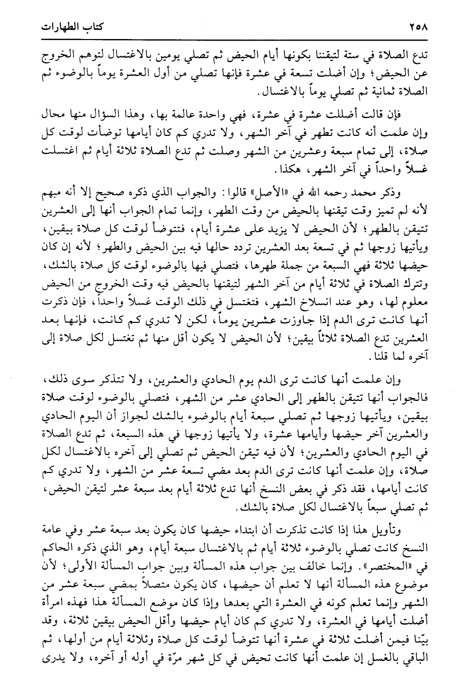 وذكر محمد رحمه الله في «الأصل» قالوا: والجواب الذي ذكره صحيح إلا أنه مبهم لأنه لم تميز وقت تيقنها بالحيض من وقت الطهر، وإنما تمام الجواب أنها إلى العشرين تتيقن بالطهر؛ لأن الحيض لا يزيد على عشرة أيام، فتتوضأ لوقت كل صلاة بيقين، ويأتيها زوجها ثم في تسعة بعد العشرين تردد حالها فيه بين الحيض والطهر؛ لأنه إن كان حيضها ثلاثة فهي السبعة من جملة طهرها، فتصلي فيها بالوضوء لوقت كل صلاة بالشك، وتترك الصلاة في ثلاثة أيام من آخر الشهر لتيقنها بالحيض فيه وقت الخروج من الحيض معلوم لها، وهو عند انسلاخ الشهر، فتغتسل في ذلك الوقت غسلاً واحداً، فإن ذكرت أنها كانت ترى الدم إذا جاوزت عشرين يوماً، لكن لا تدري كم كانت، فإنها بعد العشرين تدع الصلاة ثلاثاً بيقين؛ لأن الحيض لا يكون أقل منها ثم تغتسل لكل صلاة إلى آخره لما قلنا.
