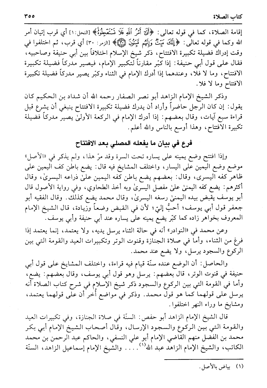 وإذا افتتح وضع يمينه على يساره تحت السرة وقد مرّ هذا، ولم يذكر في «الأصل» موضع وضع اليمين على اليسار، واختلف المشايخ فيه قال: يضع باطن كف اليمين على ظاهر كفه اليسرى، وقال: بعضهم يضع باطن كفه اليمين على ذراعه اليسرى، وقال أكثرهم: يضع كفه اليمنى على مفصل اليسرى وبه أخذ الطحاوي، وفي رواية الأصول قال أبو يوسف يقبض بيده اليمنى رسغه اليسرى، وقال محمد يضع كذلك. وقال الفقيه أبو جعفر قول أبي يوسف؛ أحبُّ إليّ؛ لأن في القبض وضعاً وزيادة، قال الشيخ الإمام المعروف بخواهر زاده كما كبّر يضع يمينه على يساره عند أبي حنيفة وأبي يوسف.