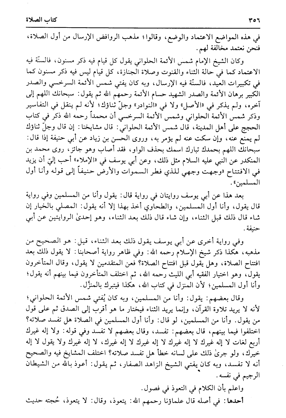 وكان الشيخ الإمام شمس الأئمة الحلواني يقول كل قيام فيه ذكر مسنون، فالسنّة فيه الاعتماد كما في حالة الثناء والقنوت وصلاة الجنازة، كل قيام ليس فيه ذكر مسنون كما في تكبيرات العيد، فالسنّة فيه الإرسال، وبه كان يفتي شمس الأئمة السرخسي والصدر الكبير برهان الأئمة والصدر الشهيد حسام الأئمة رحمهم الله ثم يقول: سبحانك اللهم إلى آخره، ولم يذكر في «الأصل» ولا في «النوادر» وجلّ ثناؤك؛ لأنه لم ينقل في التفاسير وذكر شمس الأئمة الحلواني وشمس الأئمة السرخسي أن محمداً رحمه الله ذكر في كتاب الحجج على أهل المدينة، قال شمس الأئمة الحلواني: قال مشايخنا: إن قال وجلّ ثناؤك لم يمنع عنه، وإن سكت عنه لم يؤمر به، وروى الحسن بن زياد عن أبي حنيفة إذا قال: سبحانك اللهم بحمدك تبارك اسمك بحذف الواو، فقد أصاب وهو جائز، روى محمد بن المنكدر عن النبي عليه السلام مثل ذلك، وعن أبي يوسف في «الإملاء» أحب إليّ أن يزيد في الافتتاح «وجهت وجهي للذي فطر السموات والأرض حنيفاً إلى قوله وأنا أول المسلمين» .