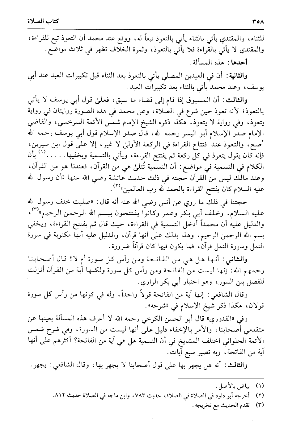 والثالث: أن المسبوق إذا قام إلى قضاء ما سبق، فعلى قول أبي يوسف لا يأتي بالتعوذ؛ لأنه تعوذ حين شرع في الصلاة، وعن محمد في هذه الصورة روايتان في رواية يتعوذ، وفي رواية لا يتعوذ، هكذا ذكره الشيخ الإمام شمس الأئمة السرخسي، والقاضي الإمام صدر الإسلام أبو اليسر رحمه الله، قال صدر الإسلام قول أبي يوسف رحمه الله أصح، والتعوذ عند افتتاح القراءة في الركعة الأولى لا غير، إلا على قول ابن سيرين، فإنه كان يقول يتعوذ في كل ركعة ثم يفتتح القراءة، ويأتي بالتسمية ويخفيها.....؟ بأن الكلام في التسمية في مواضع: أن التسمية تُتلى هي من القرآن، فعندنا هو من القرآن، وعند مالك ليس من القرآن حجته في ذلك حديث عائشة رضي الله عنها «أن رسول الله عليه السلام كان يفتتح القراءة بالحمد لله رب العالمين» .