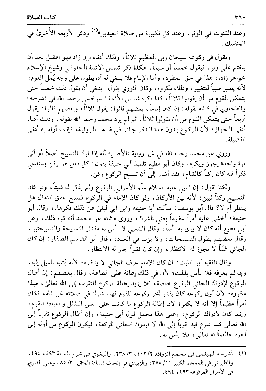 ولكنا نقول: إن النبي عليه السلام علّم الأعرابي الركوع ولم يذكر له شيئاً، ولو كان التسبيح ركناً لبين؛ لأنه بين الأركان، ولو كان الإمام في الركوع فسمع خفق النعال هل ينتظر أم لا؟ قال أبو يوسف: سألت أبا حنيفة وابن أبي ليلى عن ذلك فكرهاه، وقال أبو حنيفة؛ أخشى عليه أمراً عظيماً يعني الشرك، وروى هشام عن محمد أنه كره ذلك، وعن أبي مطيع أنه كان لا يرى به بأساً، وقال الشعبي لا بأس به مقدار التسبيحة والتسبيحتين، وقال بعضهم يطول التسبيحات، ولا يزيد في العدد، وقال أبو القاسم الصفار: إن كان الجائي غنّياً لا يجوز له الانتظار، وإن كان فقيراً جاز له الانتظار.