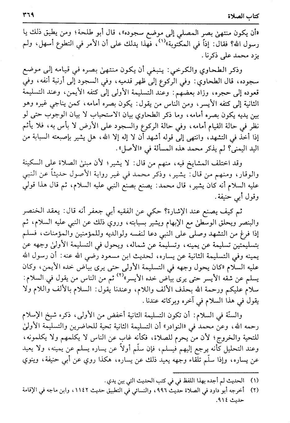 ثم كيف يصنع عند الإشارة؟ حكي عن الفقيه أبي جعفر أنه قال: يعقد الخنصر والبنصر ويحلق الوسطى مع الإبهام ويشير بسبابته، وروي ذلك عن النبي عليه السلام، ثم إذا فرغ من التشهد وصلى على النبي دعا لنفسه ولوالديه وللمؤمنين والمؤمنات، فسلم بتسليمتين تسليمة عن يمينه، وتسليمة عن شماله، ويحول في التسليمة الأولى وجهه عن يمينه وفي التسليمة الثانية عن يساره، لحديث ابن مسعود رضي الله عنه: أن رسول الله عليه السلام «كان يحول وجهه في التسليمة الأولى حتى يرى بياض خده الأيمن، وكان يسلم عن شقه الأيسر حتى يرى بياض خده الأيسر» ثم من الناس من يقول في السلام: سلام عليكم ورحمة الله بحذف الألف واللام، وعندنا يقول: السلام بالألف واللام ولا يقول في هذا السلام في آخره وبركاته عندنا.