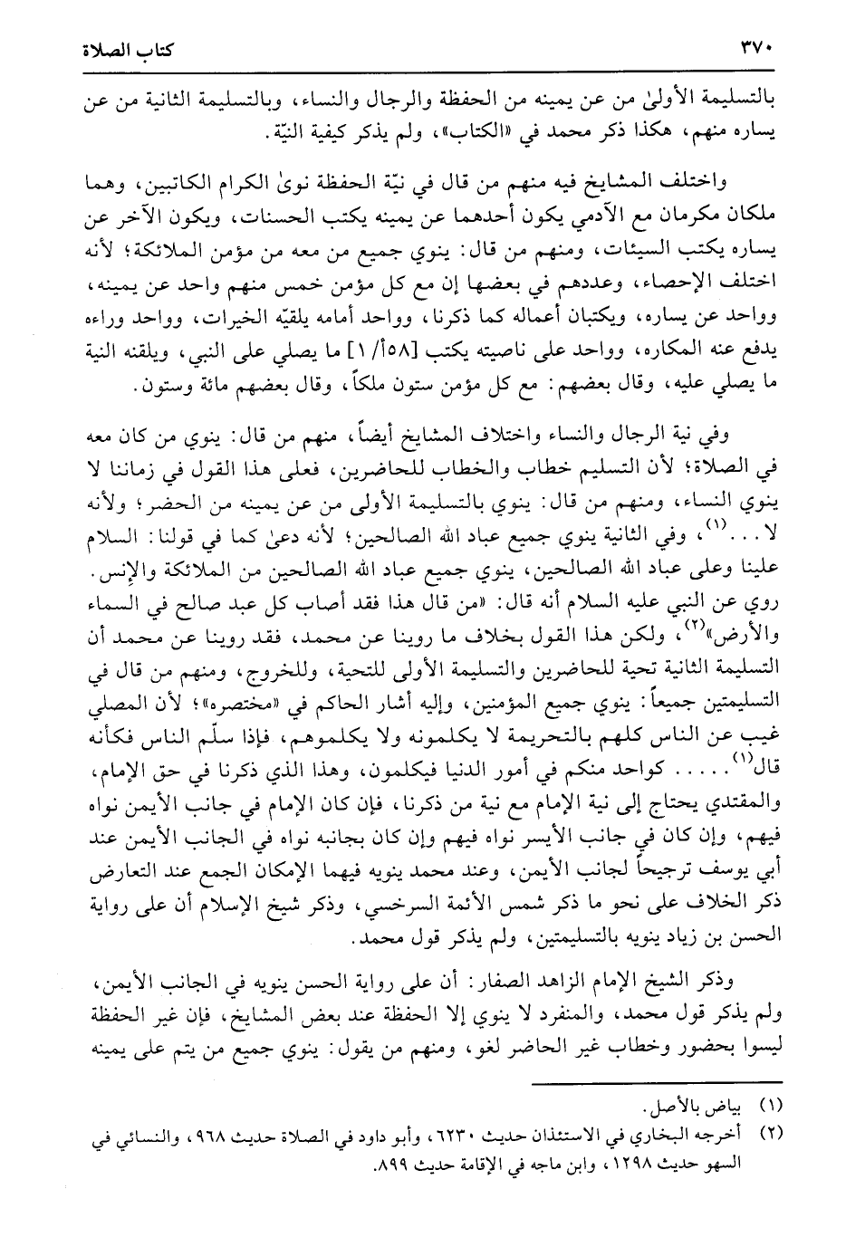 بالتسليمة الأولى من عن يمينه من الحفظة والرجال والنساء، وبالتسليمة الثانية من عن يساره منهم، هكذا ذكر محمد في «الكتاب» ، ولم يذكر كيفية النيّة.