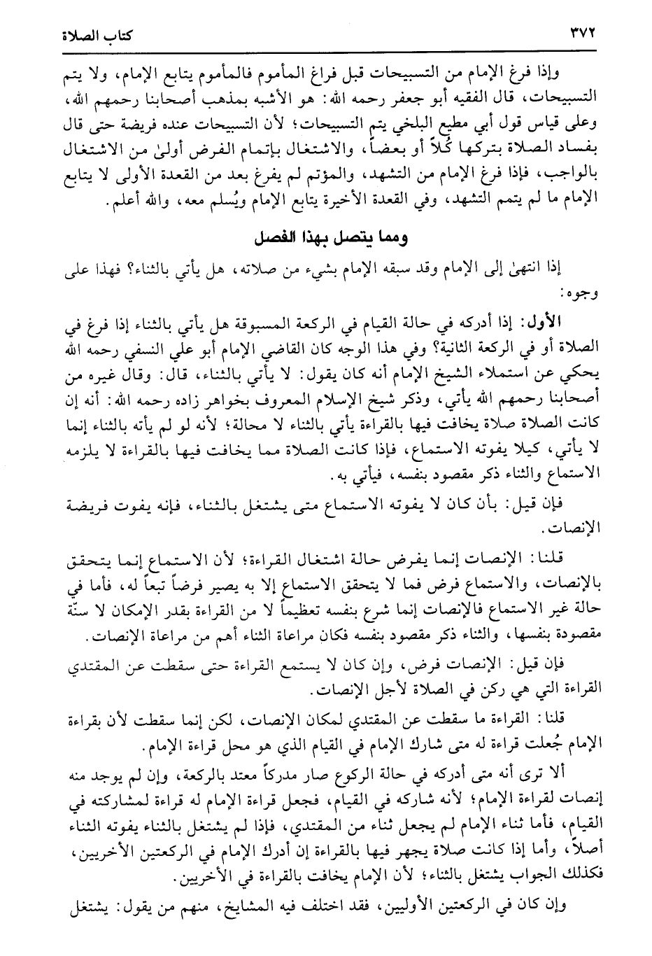 وإذا فرغ الإمام من التسبيحات قبل فراغ المأموم فالمأموم يتابع الإمام، ولا يتم التسبيحات، قال الفقيه أبو جعفر رحمه الله: هو الأشبه بمذهب أصحابنا رحمهم الله، وعلى قياس قول أبي مطيع البلخي يتم التسبيحات؛ لأن التسبيحات عنده فريضة حتى قال بفساد الصلاة بتركها كُلاً أو بعضاً، والاشتغال بإتمام الفرض أولى من الاشتغال بالواجب، فإذا فرغ الإمام من التشهد، والمؤتم لم يفرغ بعد من القعدة الأولى لا يتابع الإمام ما لم يتمم التشهد، وفي القعدة الأخيرة يتابع الإمام ويُسلم معه، والله أعلم.6