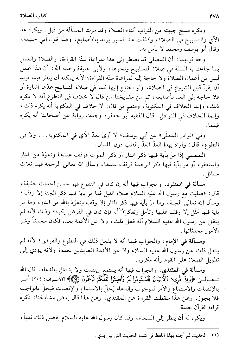 مسألة في المتفرد، والجواب فيها أنه إن كان في التطوع فهو حسن لحديث حذيفة، قال: «صليت مع رسول الله عليه السلام صلاة الليل فما مر بآية فيها ذكر الجنة إلا وقف؛ وسأل الله تعالى الجنة، وما مرّ بآية فيها ذكر النار إلا وقف وتعوّذ بالله من النار، وما مر بآية فيها مَثَل إلا وقف عليها وتأمل وتفكر» ، فإن كان في الفرض يكره؛ وذلك لأنه لم ينقل عن رسول الله عليه السلام أنه فعل ذلك، ولا عن الأئمة بعده فكان محدثاً وشر الأمور محدثاتها.