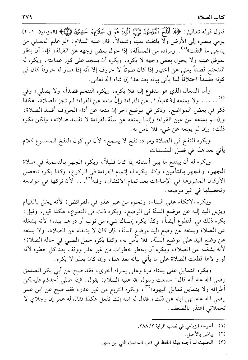 فنزل قوله تعالى: {قَدْ أَفْلَحَ الْمُؤْمِنُونَ الَّذِينَ هُمْ فِى صَلاَتِهِمْ خَشِعُونَ} (المؤمنوه: 1، 2) يومي ببصره إلى الأرض ولا يلتفت يميناً وشمالاً. قال عليه السلام: «لو علم المصلي من يناجي ما التفت» . ومراده من المسألة؛ إذا حول بعض وجهه عن القبلة، فإما أن ينظر بموفق عينيه ولا يحول بعض وجهه لا يكره، ويكره أن يسجد على كور عمامته، ويكره له التنحنح قصداً يعني عن اختيار إذا كان صوتاً لا حروف إلا أنه إذا صار له حروفاً كان في كونه مفسداً اختلافاً لما يأتي بيانه بعد هذا إن شاء الله تعالى.