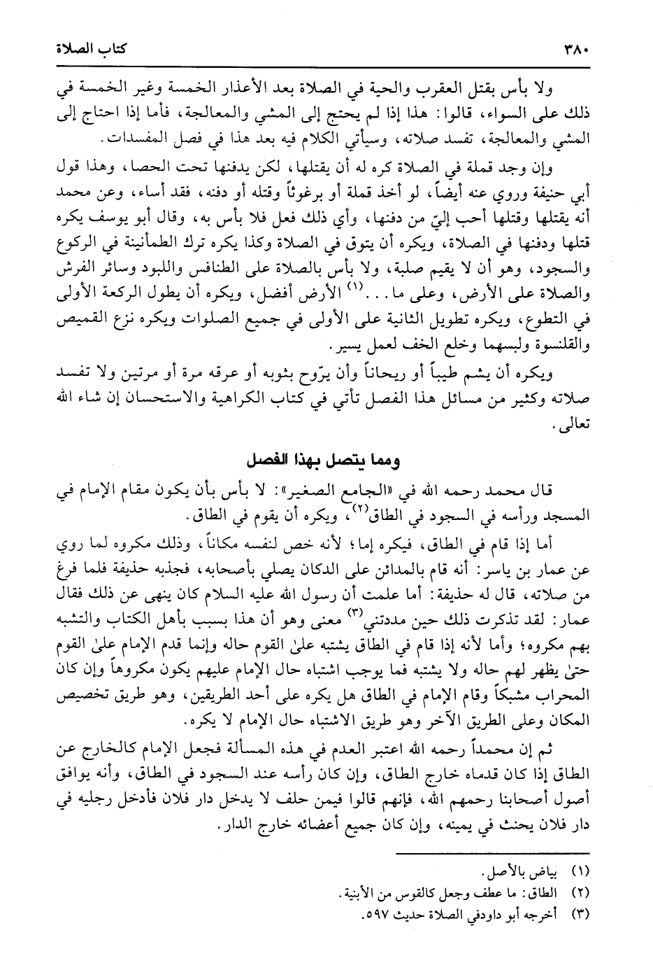وإن وجد قملة في الصلاة كره له أن يقتلها، لكن يدفنها تحت الحصا، وهذا قول أبي حنيفة وروي عنه أيضاً، لو أخذ قملة أو برغوثاً وقتله أو دفنه، فقد أساء، وعن محمد أنه يقتلها وقتلها أحب إليّ من دفنها، وأي ذلك فعل فلا بأس به، وقال أبو يوسف يكره قتلها ودفنها في الصلاة، ويكره أن يتوق في الصلاة وكذا يكره ترك الطمأنينة في الركوع والسجود، وهو أن لا يقيم صلبة، ولا بأس بالصلاة على الطنافس واللبود وسائر الفرش والصلاة على الأرض، وعلى ما ... الأرض أفضل، ويكره أن يطول الركعة الأولى في التطوع، ويكره تطويل الثانية على الأولى في جميع الصلوات ويكره نزع القميص والقلنسوة ولبسهما وخلع الخف لعمل يسير.
