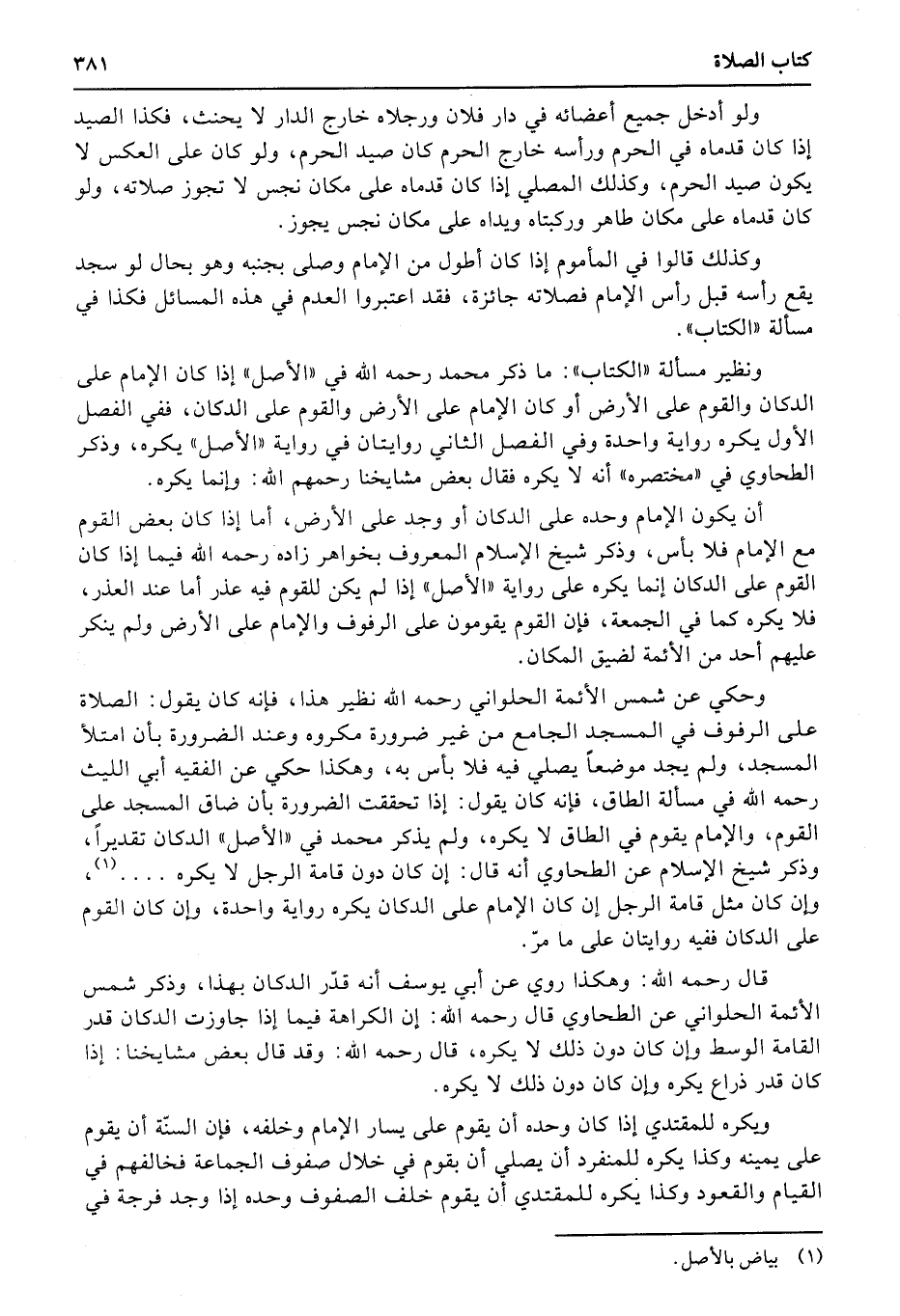 وحكي عن شمس الأئمة الحلواني رحمه الله نظير هذا، فإنه كان يقول: الصلاة على الرفوف في المسجد الجامع من غير ضرورة مكروه وعند الضرورة بأن امتلأ المسجد، ولم يجد موضعاً يصلي فيه فلا بأس به، وهكذا حكي عن الفقيه أبي الليث رحمه الله في مسألة الطاق، فإنه كان يقول: إذا تحققت الضرورة بأن ضاق المسجد على القوم، والإمام يقوم في الطاق لا يكره، ولم يذكر محمد في «الأصل» الدكان تقديراً، وذكر شيخ الإسلام عن الطحاوي أنه قال: إن كان دون قامة الرجل لا يكره....، وإن كان مثل قامة الرجل إن كان الإمام على الدكان يكره رواية واحدة، وإن كان القوم على الدكان ففيه روايتان على ما مرّ.