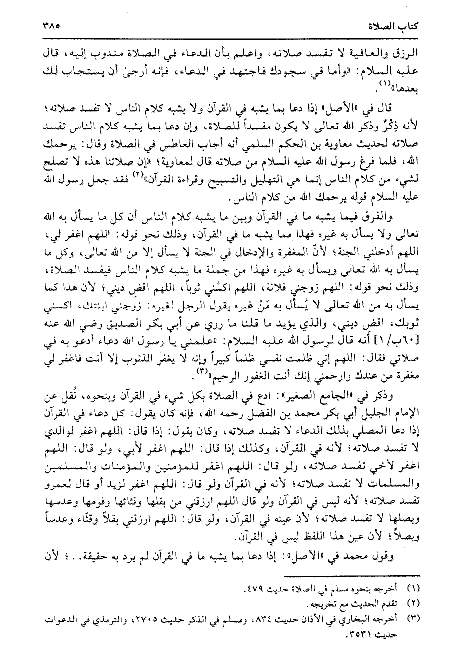 والفرق فيما يشبه ما في القرآن وبين ما يشبه كلام الناس أن كل ما يسأل به الله تعالى ولا يسأل به غيره فهذا مما يشبه ما في القرآن، وذلك نحو قوله: اللهم اغفر لي، اللهم أدخلني الجنة؛ لأنّ المغفرة والإدخال في الجنة لا يسأل إلا من الله تعالى، وكل ما يسأل به الله تعالى ويسأل به غيره فهذا من جملة ما يشبه كلام الناس فيفسد الصلاة، وذلك نحو قوله: اللهم زوجني فلانة، اللهم اكسُني ثوباً، اللهم اقضِ ديني؛ لأن هذا كما يسأل به من الله تعالى لا يُسأل به مَنْ غيره يقول الرجل لغيره: زوجني ابنتك، اكسني ثوبك، اقضِ ديني، والذي يؤيد ما قلنا ما روي عن أبي بكر الصديق رضي الله عنه (60ب1) أنه قال لرسول الله عليه السلام: «علمني يا رسول الله دعاء أدعو به في صلاتي فقال: اللهم إني ظلمت نفسي ظلماً كبيراً وإنه لا يغفر الذنوب إلا أنت فاغفر لي مغفرة من عندك وارحمني إنك أنت الغفور الرحيم» .