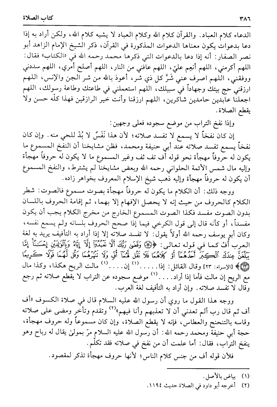 ووجه ذلك: أن الكلام ما يكون له حروفاً مهجأة بصوت مسموع فالصوت: شطر الكلام كالحروف من حيث إنه لا يحصل الإفهام إلا بهما، ثم إقامة الحروف باللسان بدون الصوت مفسد فكذا الصوت المسموع الخارج من مخرج الكلام يجب أن يكون مفسداً، أو كأنه قال إلى قول الكرخي فيما إذا صحح الحروف بلسانه ولم يسمع نفسه، وكان أبو يوسف رحمه الله أولاً يقول: لا تفسد صلاته إلا إذا أراد به التأفيف يريد به لغة العرب أُفْ كما في قوله تعالى: {وَقَضَى رَبُّكَ أَلاَّ تَعْبُدُواْ إِلاَّ إِيَّهُ وَبِالْولِدَيْنِ إِحْسَناً إِمَّا يَبْلُغَنَّ عِندَكَ الْكِبَرَ أَحَدُهُمَا أَوْ كِلاَهُمَا فَلاَ تَقُل لَّهُمَآ أُفّ وَلاَ تَنْهَرْهُمَا وَقُل لَّهُمَا قَوْلاً كَرِيمًا} (الإسراء: 23) وقال القائل: إذا..... إن.... مالت الريح هكذا، وكذا مال مع الريح إن مالت فأما إذا أراد.... موضع سجوده عن التراب لا يقطع صلاته ثم رجع وقال لا تفسد صلاته. وإن أراد به التأفيف لغة العرب.