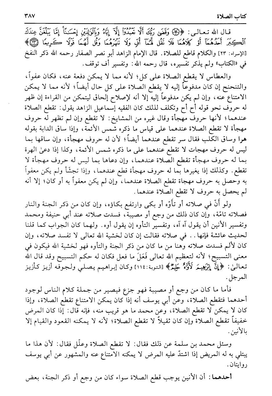 قال الله تعالى: {وَقَضَى رَبُّكَ أَلاَّ تَعْبُدُواْ إِلاَّ إِيَّهُ وَبِالْولِدَيْنِ إِحْسَناً إِمَّا يَبْلُغَنَّ عِندَكَ الْكِبَرَ أَحَدُهُمَا أَوْ كِلاَهُمَا فَلاَ تَقُل لَّهُمَآ أُفّ وَلاَ تَنْهَرْهُمَا وَقُل لَّهُمَا قَوْلاً كَرِيمًا} (الإسراء: 23) والكلام قاطع للصلاة. قال الإمام الزاهد أبو نصر الصفار رحمه الله ذكر النفخ في «الكتاب» ولم يذكر تفسيره، قال رحمه الله: وتفسير أف توقف.