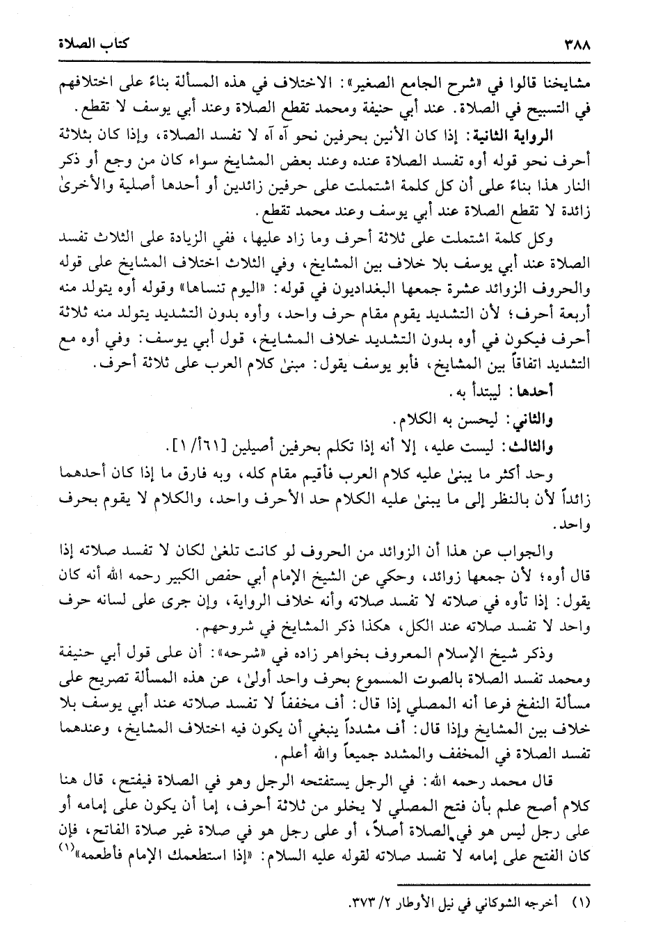 وكل كلمة اشتملت على ثلاثة أحرف وما زاد عليها، ففي الزيادة على الثلاث تفسد الصلاة عند أبي يوسف بلا خلاف بين المشايخ، وفي الثلاث اختلاف المشايخ على قوله والحروف الزوائد عشرة جمعها البغداديون في قوله: «اليوم تنساها» وقوله أوه يتولد منه أربعة أحرف؛ لأن التشديد يقوم مقام حرف واحد، وأوه بدون التشديد يتولد منه ثلاثة أحرف فيكون في أوه بدون التشديد خلاف المشايخ، قول أبي يوسف: وفي أوه مع التشديد اتفاقاً بين المشايخ، فأبو يوسف يقول: مبنى كلام العرب على ثلاثة أحرف.