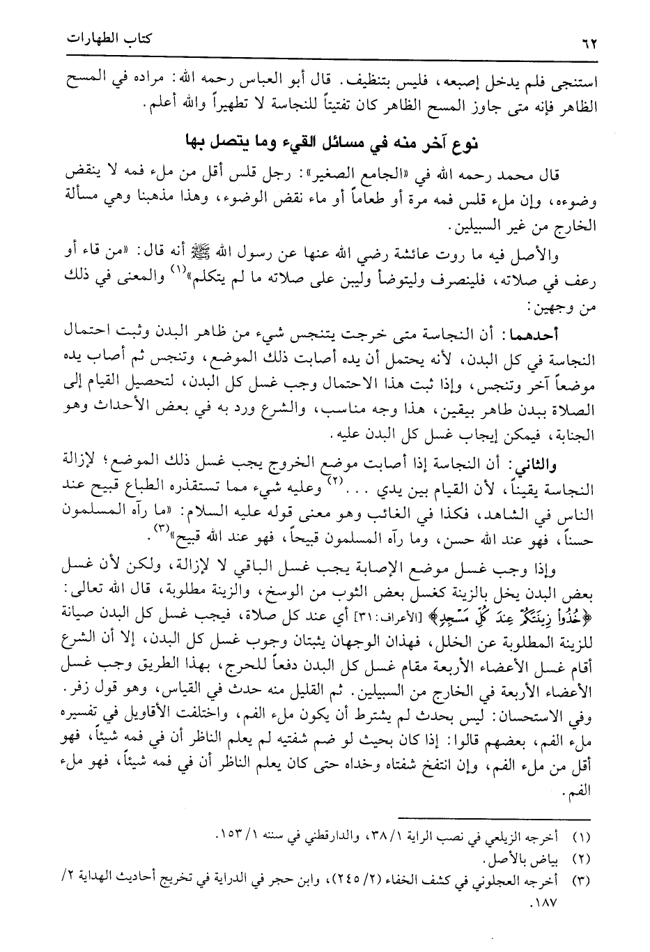 وإذا وجب غسل موضع الإصابة يجب غسل الباقي لا لإزالة، ولكن لأن غسل بعض البدن يخل بالزينة كغسل بعض الثوب من الوسخ، والزينة مطلوبة، قال الله تعالى: {خذوا زينتكم عند كل مسجد} (الأعراف:31) أي عند كل صلاة، فيجب غسل كل البدن صيانة للزينة المطلوبة عن الخلل، فهذان الوجهان يثبتان وجوب غسل كل البدن، إلا أن الشرع أقام غسل الأعضاء الأربعة مقام غسل كل البدن دفعاً للحرج، بهذا الطريق وجب غسل الأعضاء الأربعة في الخارج من السبيلين. ثم القليل منه حدث في القياس، وهو قول زفر. وفي الاستحسان: ليس بحدث لم يشترط أن يكون ملء الفم، واختلفت الأقاويل في تفسيره ملء الفم، بعضهم قالوا: إذا كان بحيث لو ضم شفتيه لم يعلم الناظر أن في فمه شيئاً، فهو أقل من ملء الفم، وإن انتفخ شفتاه وخداه حتى كان يعلم الناظر أن في فمه شيئاً، فهو ملء الفم.