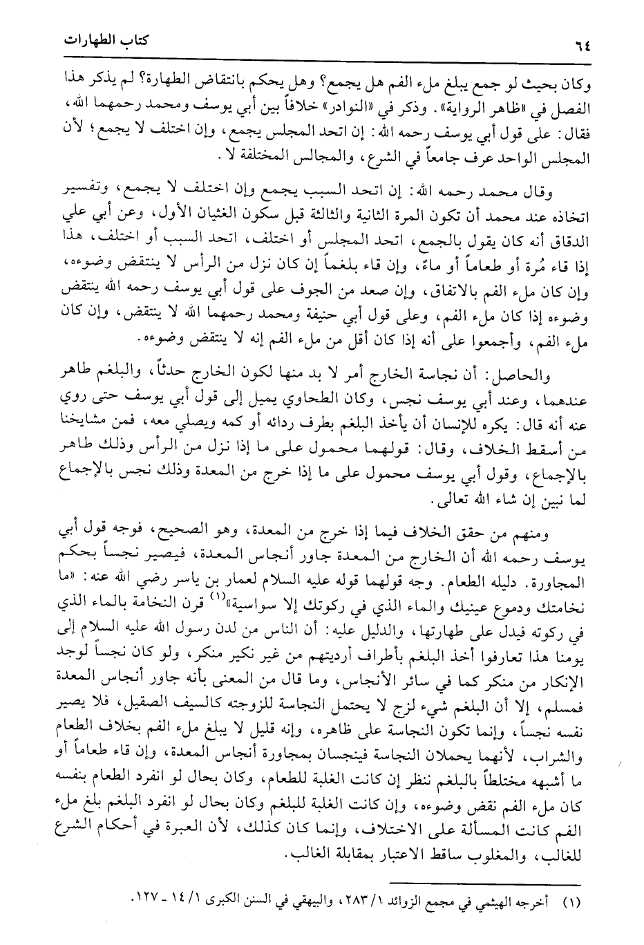 ومنهم من حقق الخلاف فيما إذا خرج من المعدة، وهو الصحيح، فوجه قول أبي يوسف رحمه الله أن الخارج من المعدة جاور أنجاس المعدة، فيصير نجساً بحكم المجاورة. دليله الطعام. وجه قولهما قوله عليه السلام لعمار بن ياسر رضي الله عنه: «ما نخامتك ودموع عينيك والماء الذي في ركوتك إلا سواسية» (قرن) النخامة بالماء الذي في ركوته فيدل على طهارتها، والدليل عليه: أن الناس من لدن رسول الله عليه السلام إلى يومنا هذا تعارفوا أخذ البلغم بأطراف أرديتهم من غير نكير منكر، ولو كان نجساً لوجد الإنكار من منكر كما في سائر الأنجاس، وما قال من المعنى بأنه جاور أنجاس المعدة فمسلم، إلا أن البلغم شيء لزج لا يحتمل النجاسة للزوجته كالسيف الصقيل، فلا يصير نفسه نجساً، وإنما تكون النجاسة على ظاهره، وإنه قليل لا يبلغ ملء الفم بخلاف الطعام والشراب، لأنهما يحملان النجاسة فينجسان بمجاورة أنجاس المعدة، وإن قاء طعاماً أو ما أشبهه مختلطاً بالبلغم ننظر إن كانت الغلبة للطعام، وكان بحال لو انفرد الطعام بنفسه كان ملء الفم نقض وضوءه، وإن كانت الغلبة للبلغم وكان بحال لو انفرد البلغم بلغ ملء الفم كانت المسألة على الاختلاف، وإنما كان كذلك، لأن العبرة في أحكام الشرع للغالب، والمغلوب ساقط الاعتبار بمقابلة الغالب.