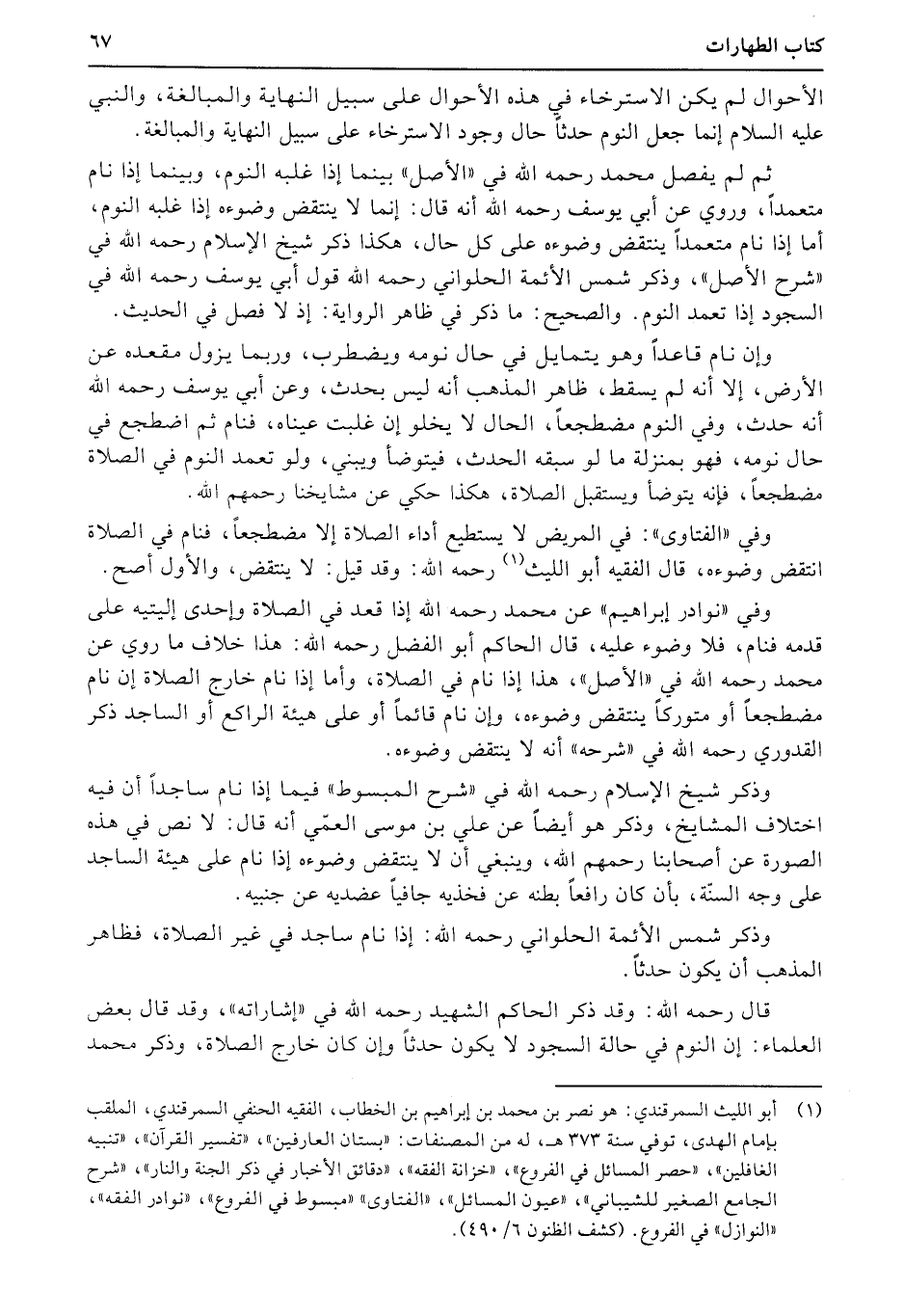 قال رحمه الله: وقد ذكر الحاكم الشهيد رحمه الله في «إشاراته» ، وقد قال بعض العلماء: إن النوم في حالة السجود لا يكون حدثاً وإن كان خارج الصلاة، وذكر محمد