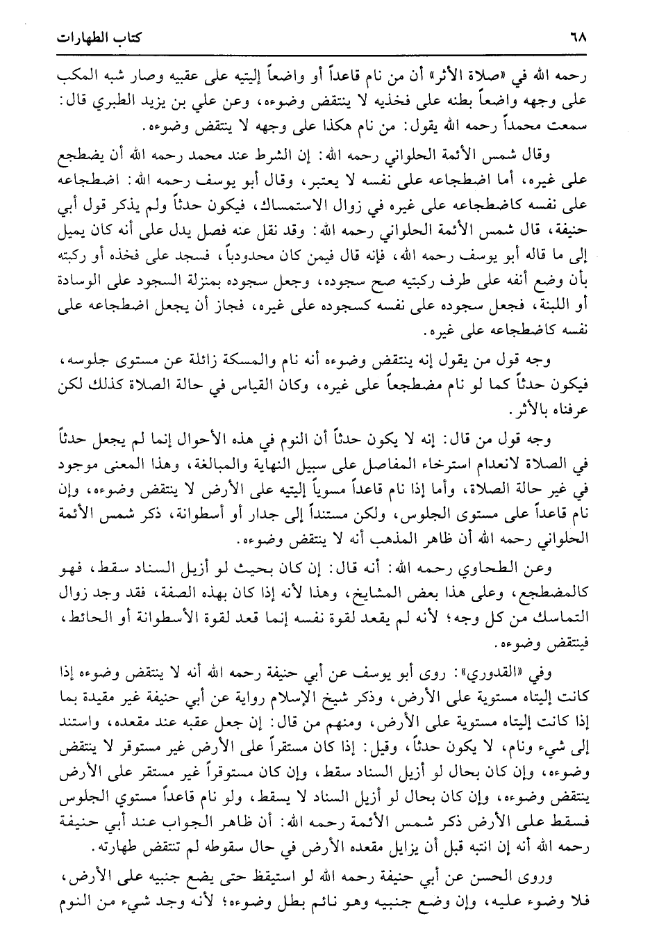 رحمه الله في «صلاة الأثر» أن من نام قاعداً أو واضعاً إليتيه على عقبيه وصار شبه المكب على وجهه واضعاً بطنه على فخذيه لا ينتقض وضوءه، وعن علي بن يزيد الطبري قال: سمعت محمداً رحمه الله يقول: من نام هكذا على وجهه لا ينتقض وضوءه.