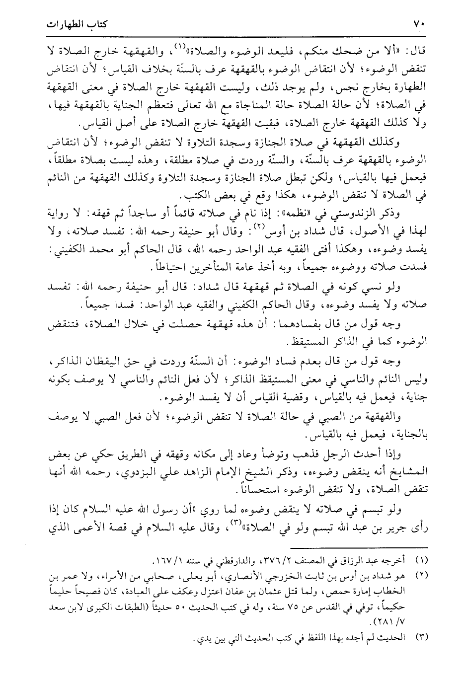 وكذلك القهقهة في صلاة الجنازة وسجدة التلاوة لا تنقض الوضوء؛ لأن انتقاض الوضوء بالقهقهة عرف بالسنّة، والسنّة وردت في صلاة مطلقة، وهذه ليست بصلاة مطلقاً، فيعمل فيها بالقياس؛ ولكن تبطل صلاة الجنازة وسجدة التلاوة وكذلك القهقهة من النائم في الصلاة لا تنقض الوضوء، هكذا وقع في بعض الكتب.
